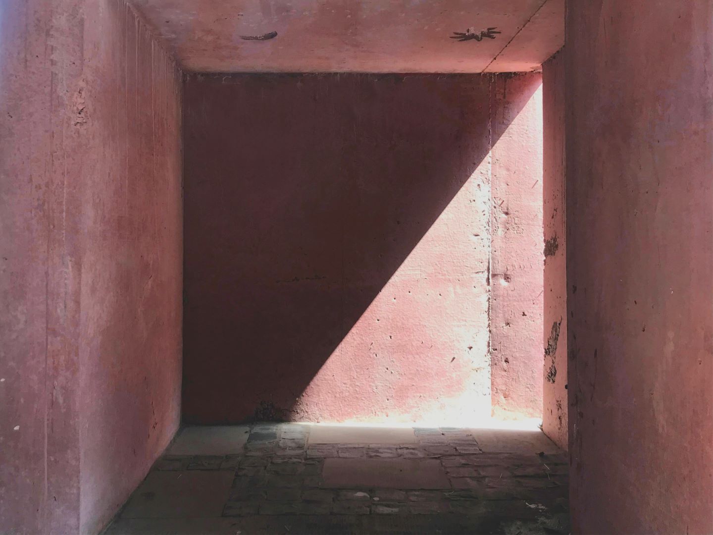 Structurally, the base of the temple is a square which becomes a triangle as it reaches the top creating five surfaced pyramids. An expression of movement is created by pulling a small mass out of the main structure creating a space for meditation. A slit in the structure allows air and light to stream through. Generally in a Hindu temple the innermost sanctum is reached by a series of mandapas. Here, the sanctum opens directly to the outdoor space and is attached with a small meditation area which allows a passer-by to offer a quick prayer. There are two major openings to the building, one which forms the entrance, another for the holy water (which is offered to Shiva) to go out. The two openings form a connection at the top as the pyramid cantilevers.