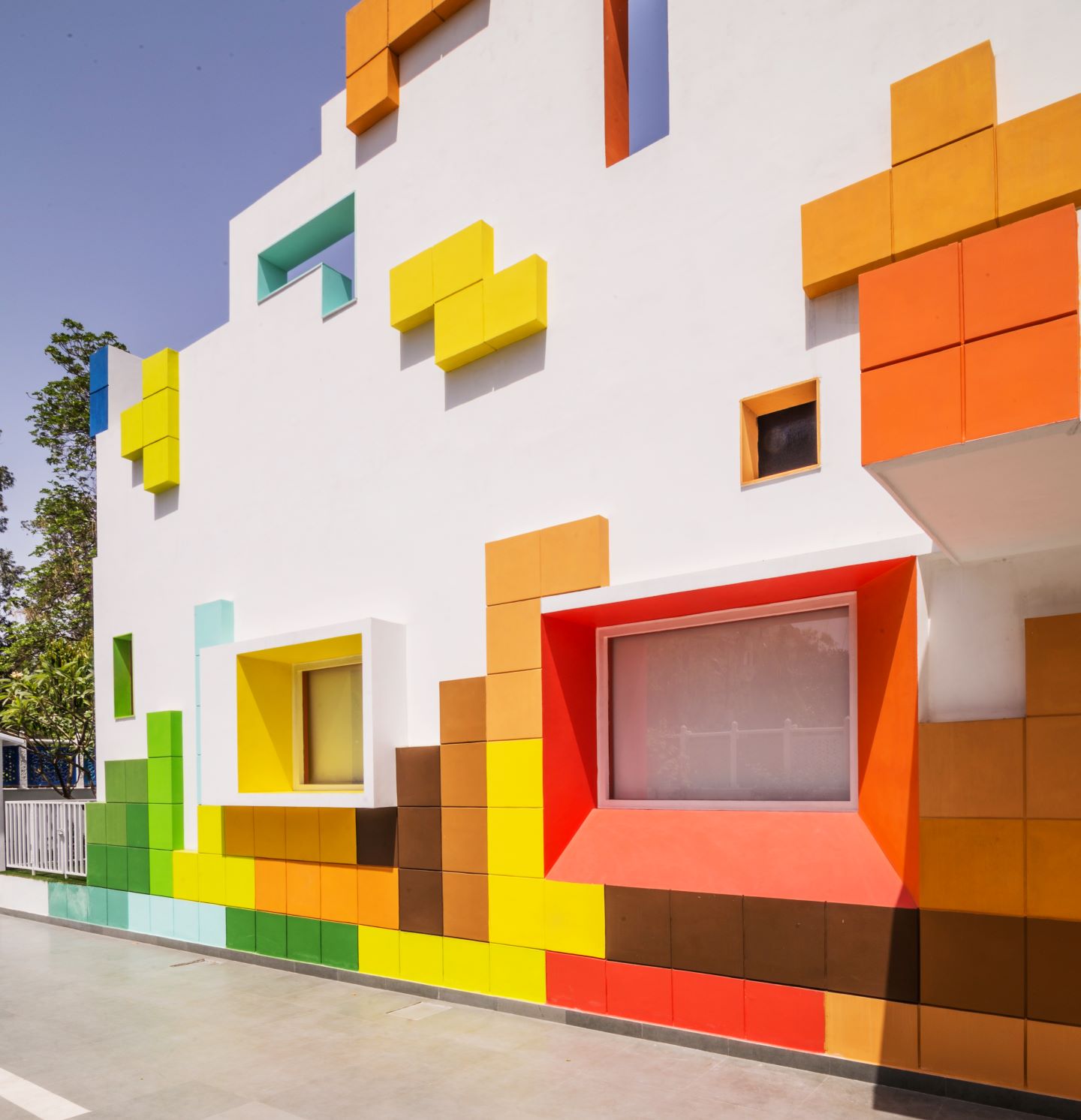 The studio’s ideology for this pre-nursery school raises an argument to the new style of architecture (A Renaissance of Art) for the learning and growth of the little ones. The studio came up with a design mapping of all the games the kids would play in that age group; finally reaching a stage where the Tetris game could be clubbed with the architecture’s skin. The architects wanted to create a reaction and response from a young one in order to make them learn from the exterior environment.