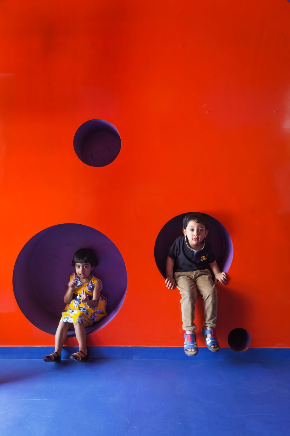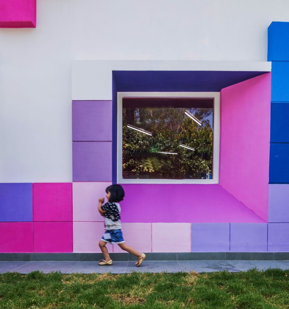 The old dilapidated structure needed a layered outlook with the Tetris design elements adding the right colour and volume to the architecture. The strategic and consistent use of colour establishes a stimulating and playful identity for the campus, acting as a visual connective tissue throughout the child’s daily experience. Further, a running gradient of colours on the tetris-ized facade creates a value-addition to the already playful facade. Within this predefined framework, playful architectural interventions occurred (tetris architectural brick volumes) at the children’s scale, creating reading nooks between classrooms, formal/impromptu seating areas and sculpted terrain.