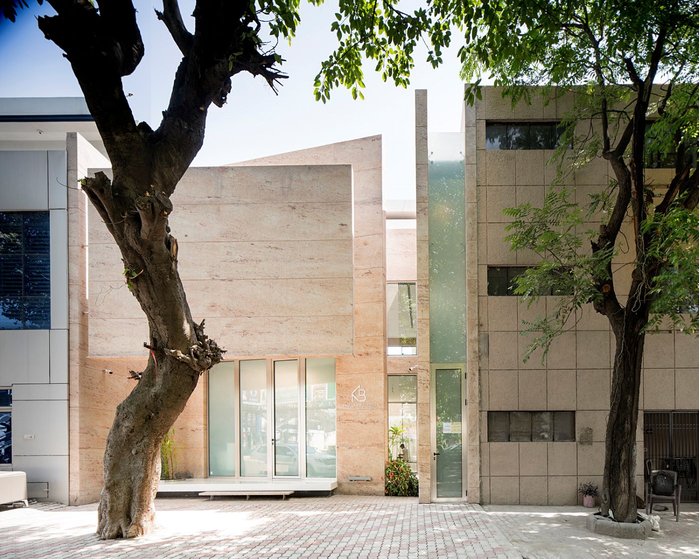 All the requirements were met with a clear thought of spaces flowing into one another along with a large central volume. Two intersecting walls that form a sort of “L” allow reorienting the entrance towards the main centre of the commercial hub; while the other wall allows separate access to the third level and the washrooms. The central ellipse on the ground level is the closed meeting room which is attached to the main office as well as the central space. The interjection of courtyards and skylights is a strategy that allows one to experience the fragments of nature, and break the powerful geometry of the elements of design. The facade is like a blank canvas for the light to manifest its magic filtering through the foliage of the tree right in front of the site.