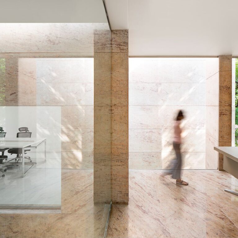 As the site was narrow and small, the architects designed a closed box opening mostly skywards but with careful gaps looking into the street, and used the courtyard as a buffer between the inside and outside. The strong and clear geometry of intersecting lines and an ellipse resolve a complex brief and create the requisite spatial sequence. The overall material palette is limited to only white marble and Sivakasi gold granite, along with simple white painted surfaces.