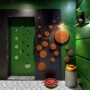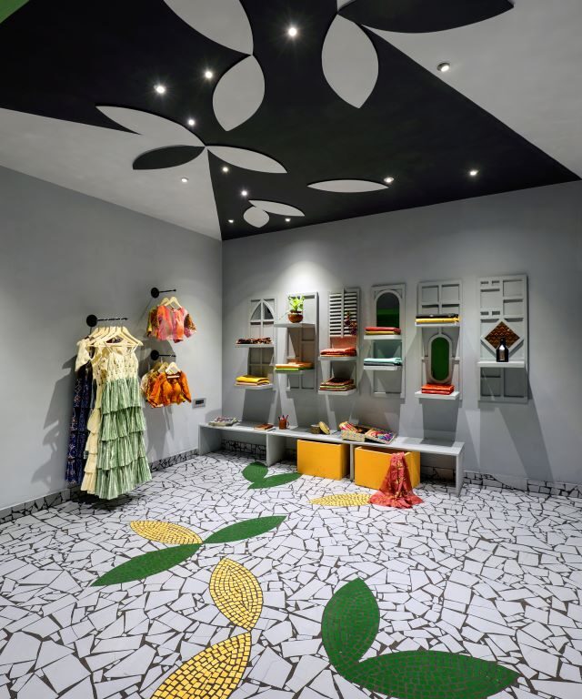 The entrance gateway is dressed in two dark and contrasting colours (black and green) and energised with a random bubble-like pattern of mosaic tiles. The handles of the main door are fashioned out of old table legs. Inside, the layout combines two rooms together through graphics and material frames, giving a different perspective when viewed from any edge. While one room displays garments, the other functions as a material selection area.