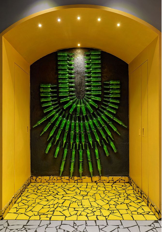 As a cost-effective and environment-responsive project, the design recycles various scrap materials ideal for interior surfaces to create a pleasing ambience. The materials were chosen in a palette of contrasting tones: waste clay roof tiles, waste beer bottles, damaged flooring tiles, recycled window shutters, unused sample tiles, waste metal rings and mirror. At the same time, the quality of these materials provides longevity with aesthetics.