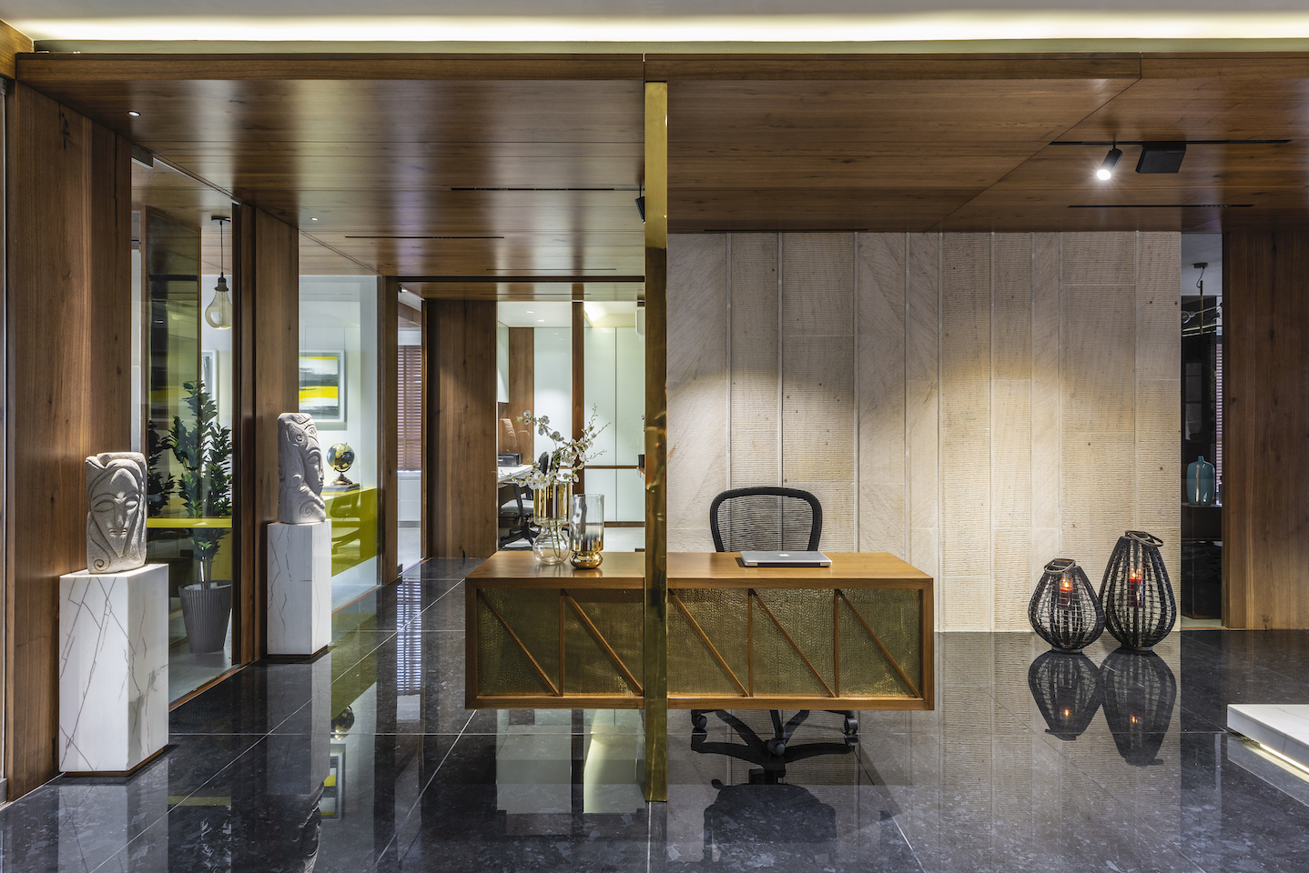 The spacious reception in stone and wood forms the prelude to the design story. Rendered from a single stone and finished in various textures, the focal wall behind the desk sets the tone of the narrative.