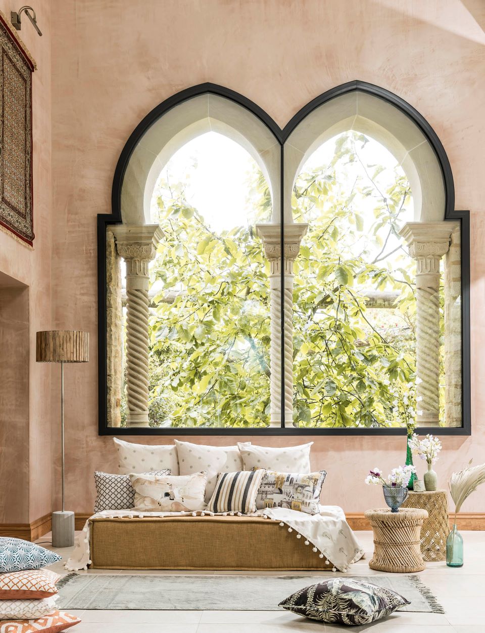 The collection showcases painted palm trees, architectural geometrics and metallic threads inspired by filigree and glimmering coins. The Prince himself appears on horseback journeying across desert sands in this eclectic range which consists of silk inspired plains, exotic prints, with coordinating weaves and embroideries. The materials featured in the collection includes cotton, viscose, linen and polyester.