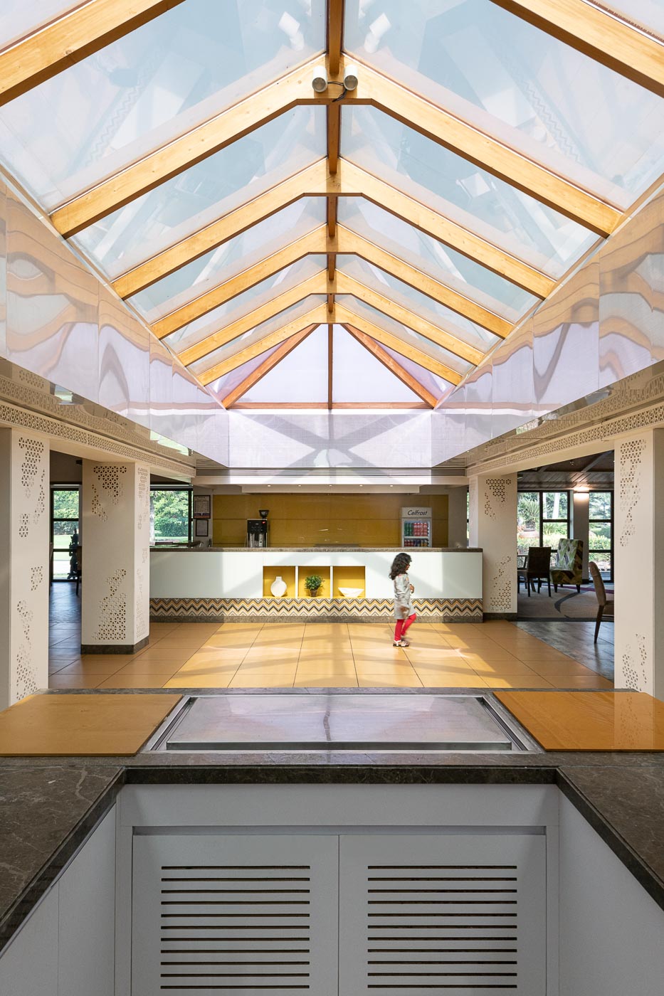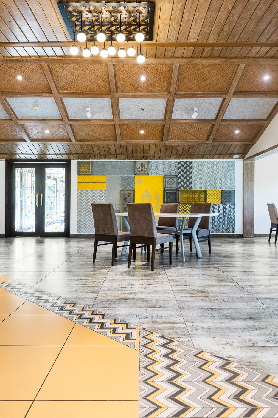 The 24×7 Coffee Shop at the luxury resort in Anand, Madhubhan Resort & Spa, is spread across 7,000 square feet and is set amidst a lush green landscape. Therefore, to keep the visitors connected with nature, the coffee shop is encased in glass fenestrations and a large skylight which filters in natural light. The lushness of the surroundings also dictated the simple material palette the architects worked with for this project — mild wood grain members, chattai, vitrified ceramic white, grey and yellow tiles and customised furniture and lighting.