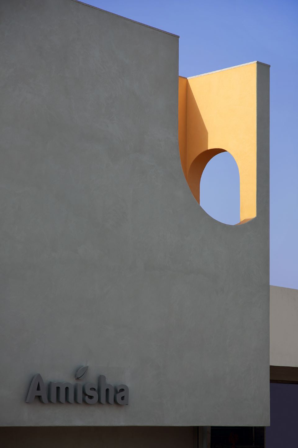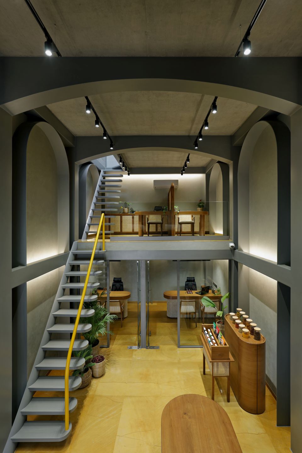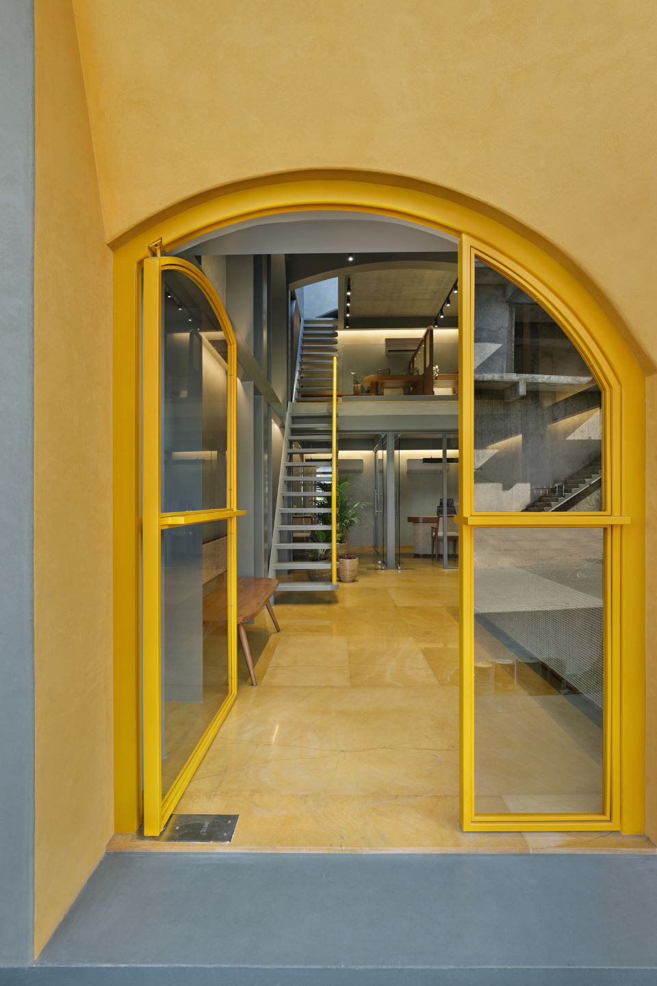 The Yellow Box is an office designed by Traanspace in Vadodara for a client who is engaged in the wholesale business of spices. Set in a densely woven grocery market in the main city area of Vadodara, the site is a very tight plot of 450 sq ft enveloped by shops. The interiors and exteriors of the office was conceptualised synchronously to allow simplicity and playfulness to exist cohesively. In response to the space crunch, the simple idea of having a double-height space overlooking the mezzanine area opened a new dimension adding immense volume to the office. The material palette comprises grey and yellow lime plaster, metal structures, yellow Jaisalmer flooring inspired from turmeric, wood and bamboo wicker furniture. The grey lime plastered facade provides a backdrop to the yellow arched openings.