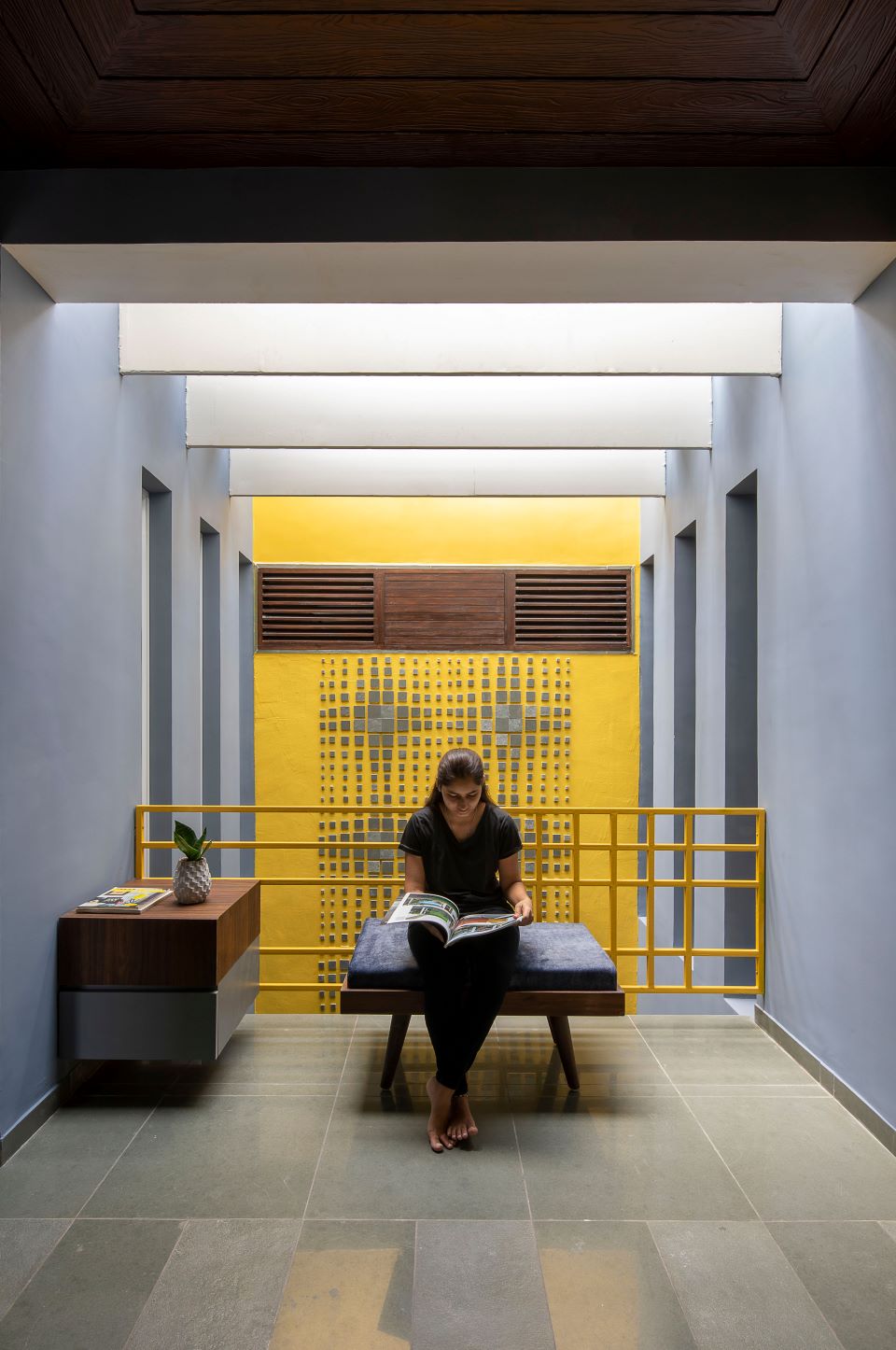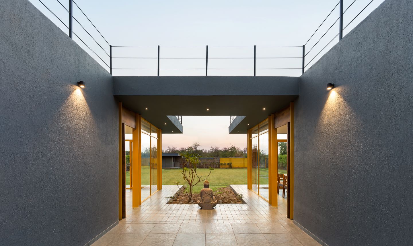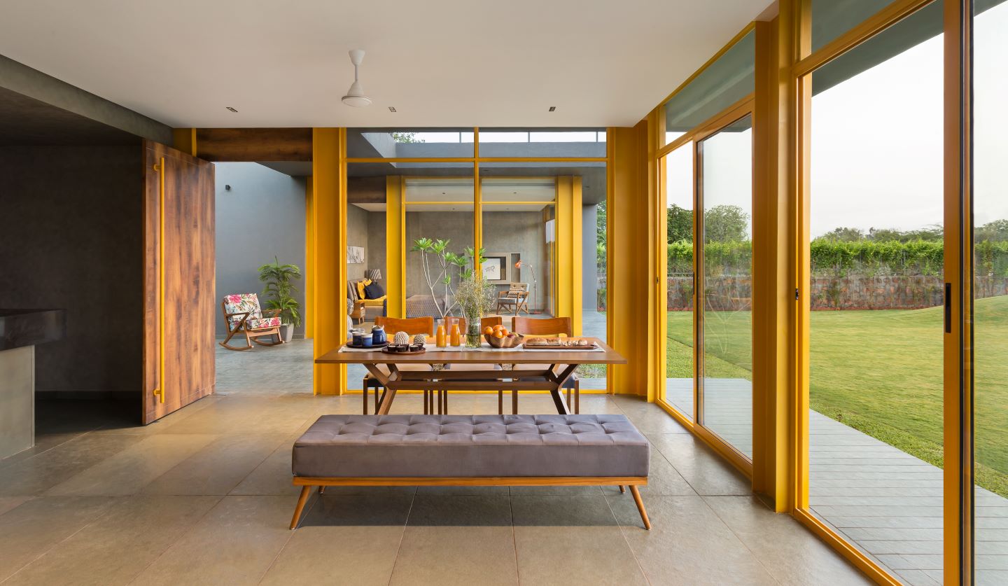 The Yellow Box is a weekend home designed by Workshop Inc in the outskirts of Ahmedabad. Conceptualised as a verandah to live in, this house is designed to enjoy a night out with friends and family. The structure is designed as a long rectilinear space, with separate volumes for the private and public areas tied together by a bridge on top. Leather-finished local limestone (kota stone) on the floor, and the cement texture on the walls add visual and tactile characteristics to the space. It becomes a subdued canvas for the vibrant yellow of the structure and the pops of colours added in the furnishings.