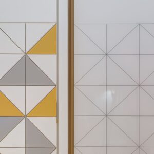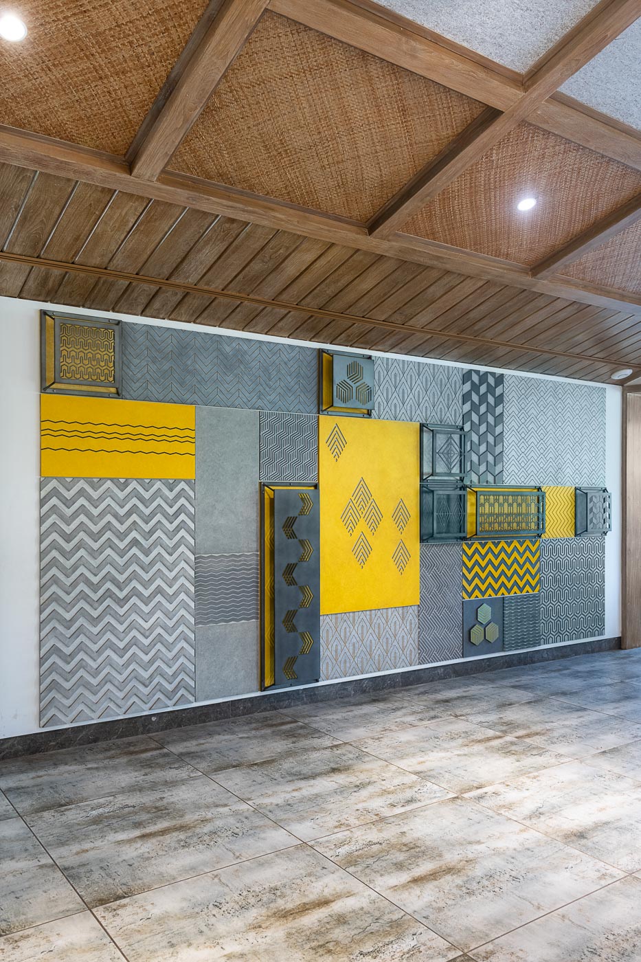 The highlight of the space is the wall mural created by graphic artist Meera Dabir, which generates drama and movement. The artist’s design intent was to be frugal with elements and extravagant with treatments. The elements chosen were a single motif, the chevron pattern; and a duochrome colour scheme of canary yellow and grey. The collage was created by varying up the motif, scale, symmetry, cut-depth, spacing and thickness of each individual MDF grid block. Additionally, laser-cut metal offsets were added for more dimension. Like the choice of motif and treatment, the choice of colour — shades of grey and canary yellow — was used to create a sense of variety and interest while, simultaneously enforcing order and cohesion to bring the individual pieces together into a balanced whole.
