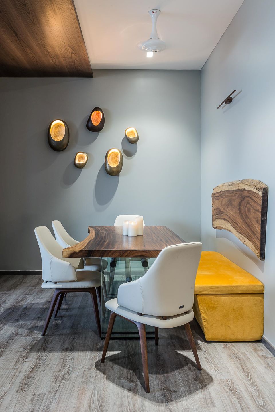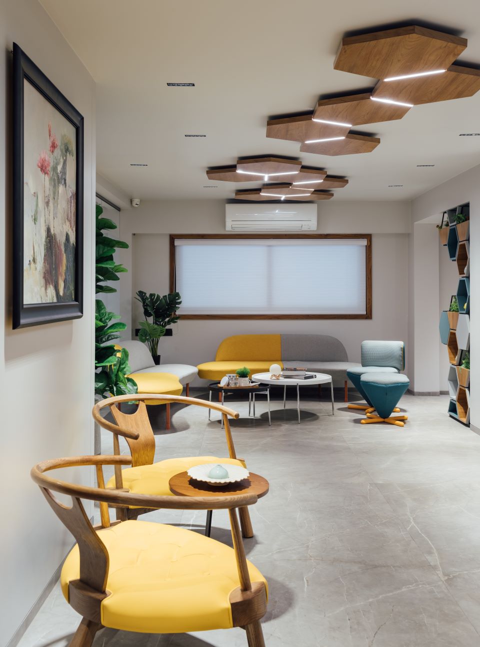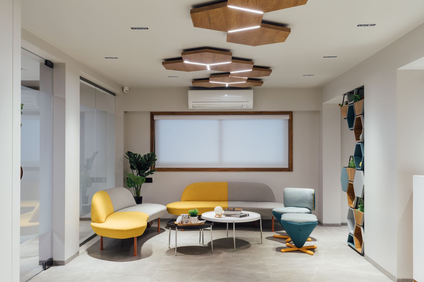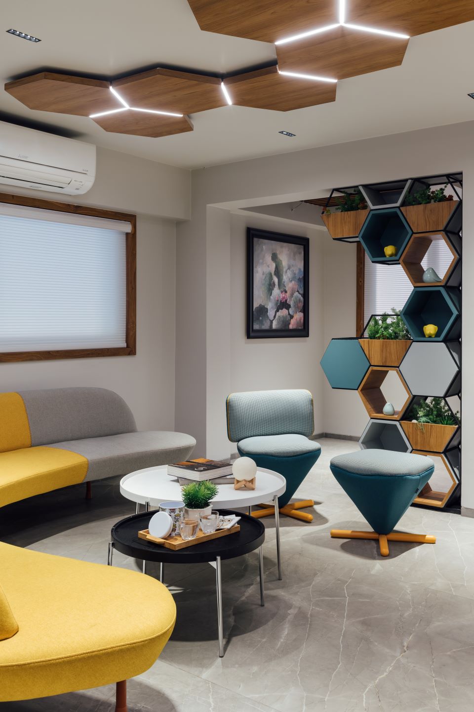 Materials and geometry played an instrumental role in defining the morphology and aesthetics of this office designed by Advait Architects. Upon entering, an elegant waiting room is visualised with use of vibrant colours like yellow, grey, a pinch of blue and brown,  and abstract furniture and furnishings. Materials, colours and textures have been used to achieve compositions that adopt largely straight-lined furniture, warmed up with the points of interest such as the bespoke hexagonal light fixture carved in wood and a softly angled armchair. Grey glossy tiles of flooring balances provide a counterpoint to these quirky elements.
