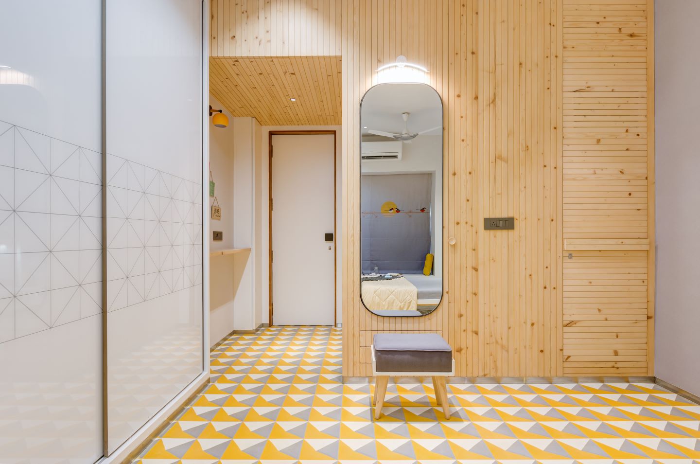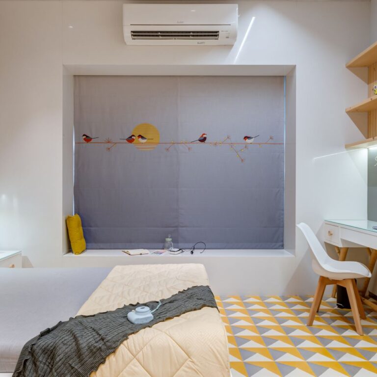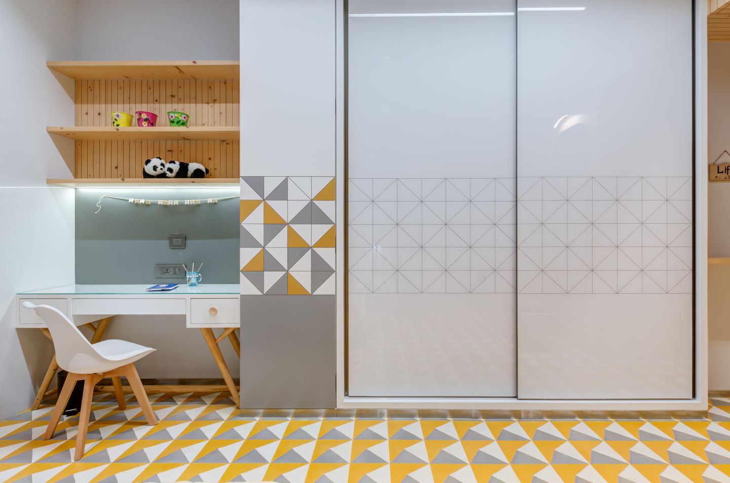 At the Saket Residence designed by The Brick Tales, each space is defined by the use of vibrant colours to add a new experience every time a new threshold is crossed. For the younger daughter’s bedroom, the idea was to add a unique character that would be suitable as well as well timeless. Instead of adding colours to the walls, a printed cement floor from Bharat Flooring with shades of yellow, grey and white was selected while keeping the walls a neutral muted tone of grey and white. The curtains were also custom-made in hand embroidery using the same tones to create a coherence with the floor.