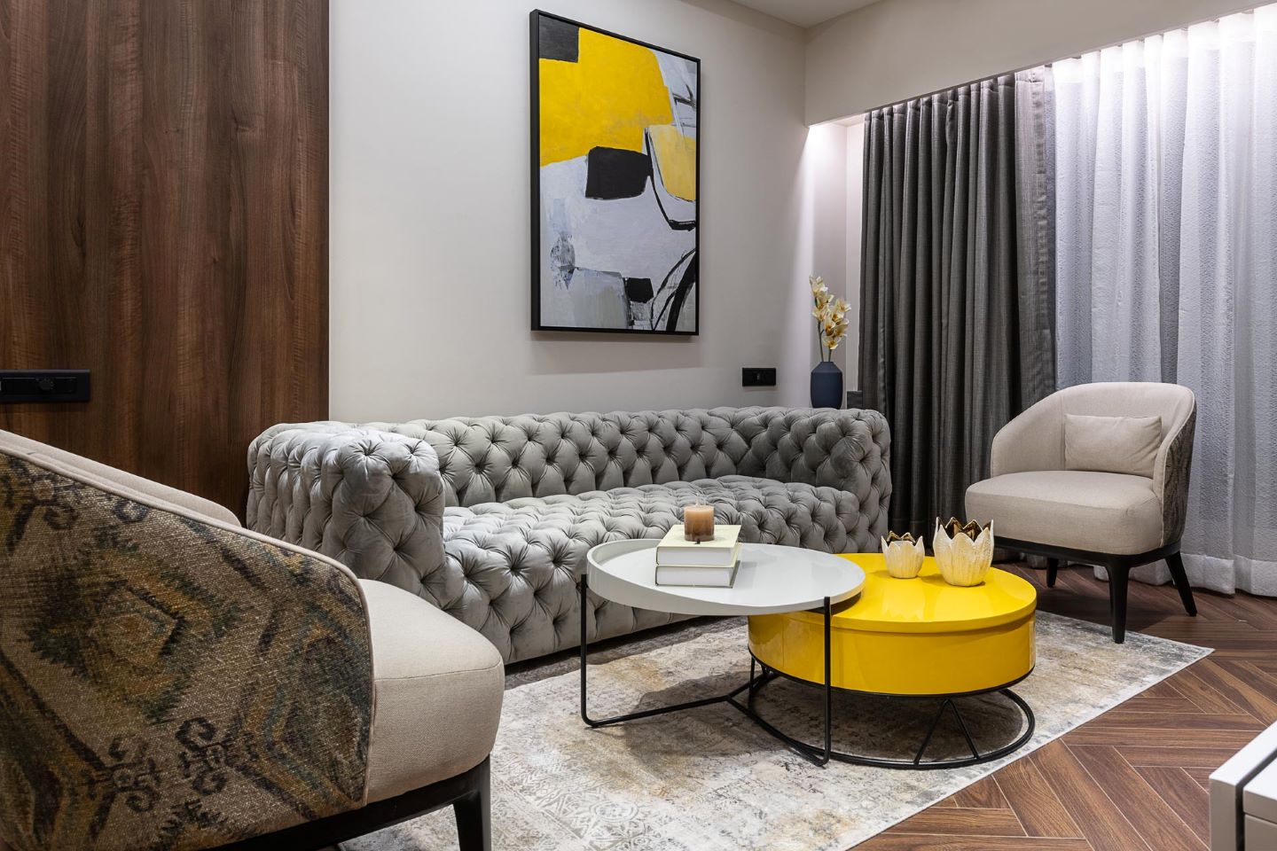 A compact apartment in Mumbai sees a smart use of colour-blocking to establish a lively, energetic environment. While the larger feel is of a grey-toned neutral space, strategic infusions of bright yellow introduce an effervescent touch. A tufted grey sofa and earthy armchairs surround a vibrant centre table whose cheery hue spills into the oversized abstract artwork. A grey-gold rug strengthens the colour scheme which is inspired by Pantone’s 2021 colour pairing symbolising thoughtfulness and hope.