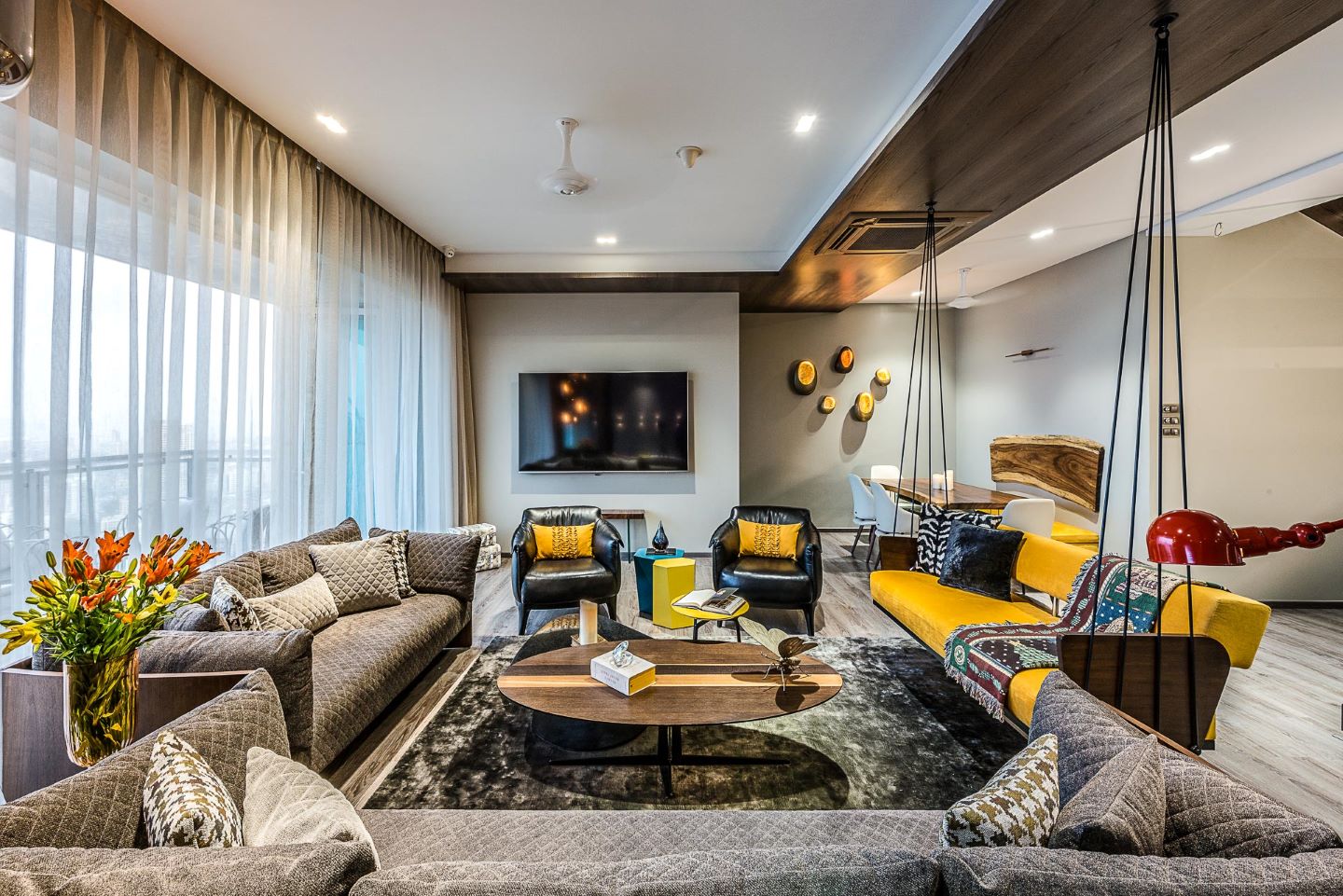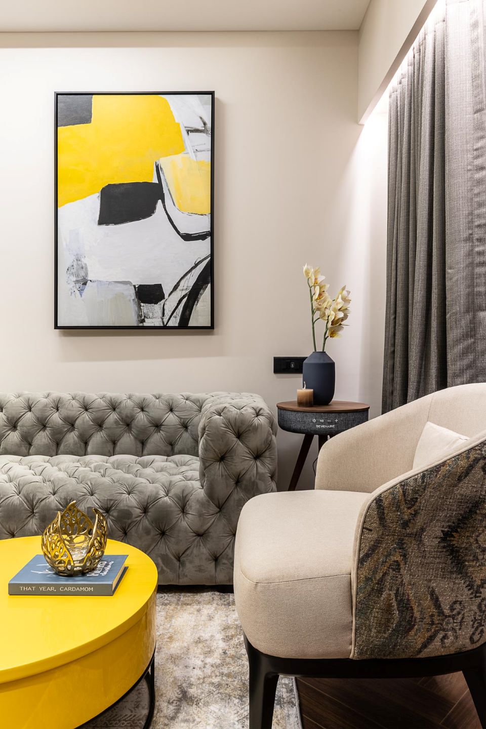 In this Mumbai apartment, a traditional spirit and an international aesthetic co-exist harmoniously. The swing, a staple of Indian households of yore, occupies centrestage of a setting replete with impeccable furniture and light fixtures. The design direction is minimal, yet layered with warmth and colours. The understated earthy-grey look is liberated from sedateness with vibrant hues — mainly yellow.