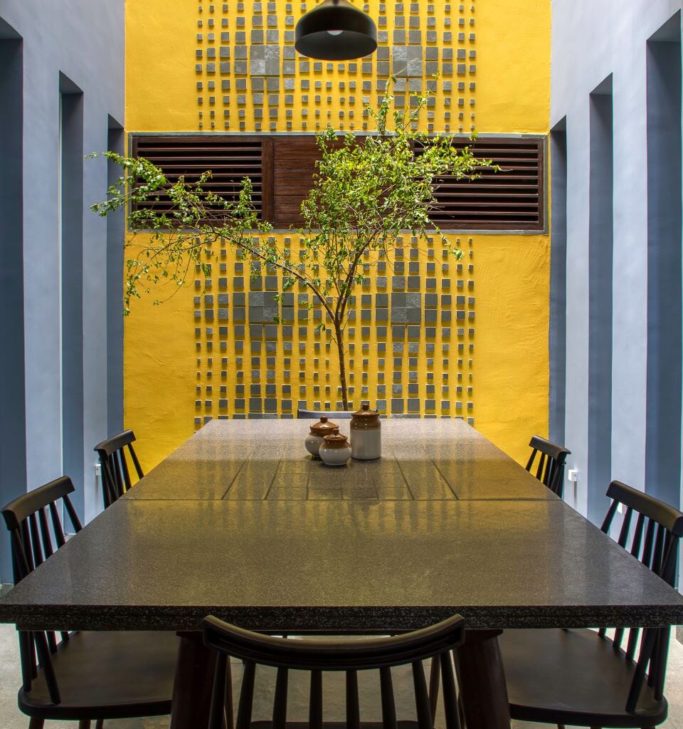 The courtyard plays a crucial role in establishing the spatial experience in this project, not surprisingly called the Vertical Courtyard House. The double-height wall of a soaring volume near the dining area sports a glowing yellow — which also highlights the railing of the landing on the upper level. The sunny hue forms a backdrop to a ‘pixelated’ 3D mural rendered from waste stone. The skylight that crowns this volume animates this textural art, as well as lightens the gravitas of the grey walls of the courtyard.