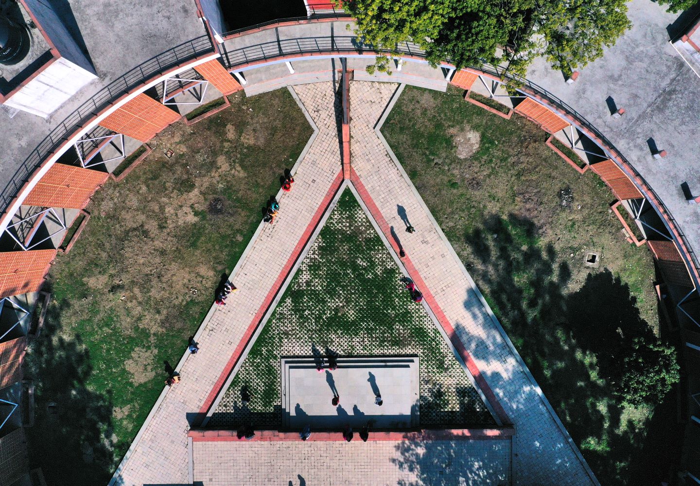 At the mid-point of the arc, lies a skewed meditation hall which is placed inside the serenity of the green orchard and aims to help its users revitalise their body and soul by connecting with nature. Towards the other end of the central axis, stands the majestic bungalow as a reminiscent of past glory, with its gabled roof, forming a focal element of the entire campus. The curved corridor with its intermittent facade openings, encloses a central circular courtyard of 40 m diameter. The central landscape forms a plaza, an open-air theatre, and a stage area, all overlooking the entire space.