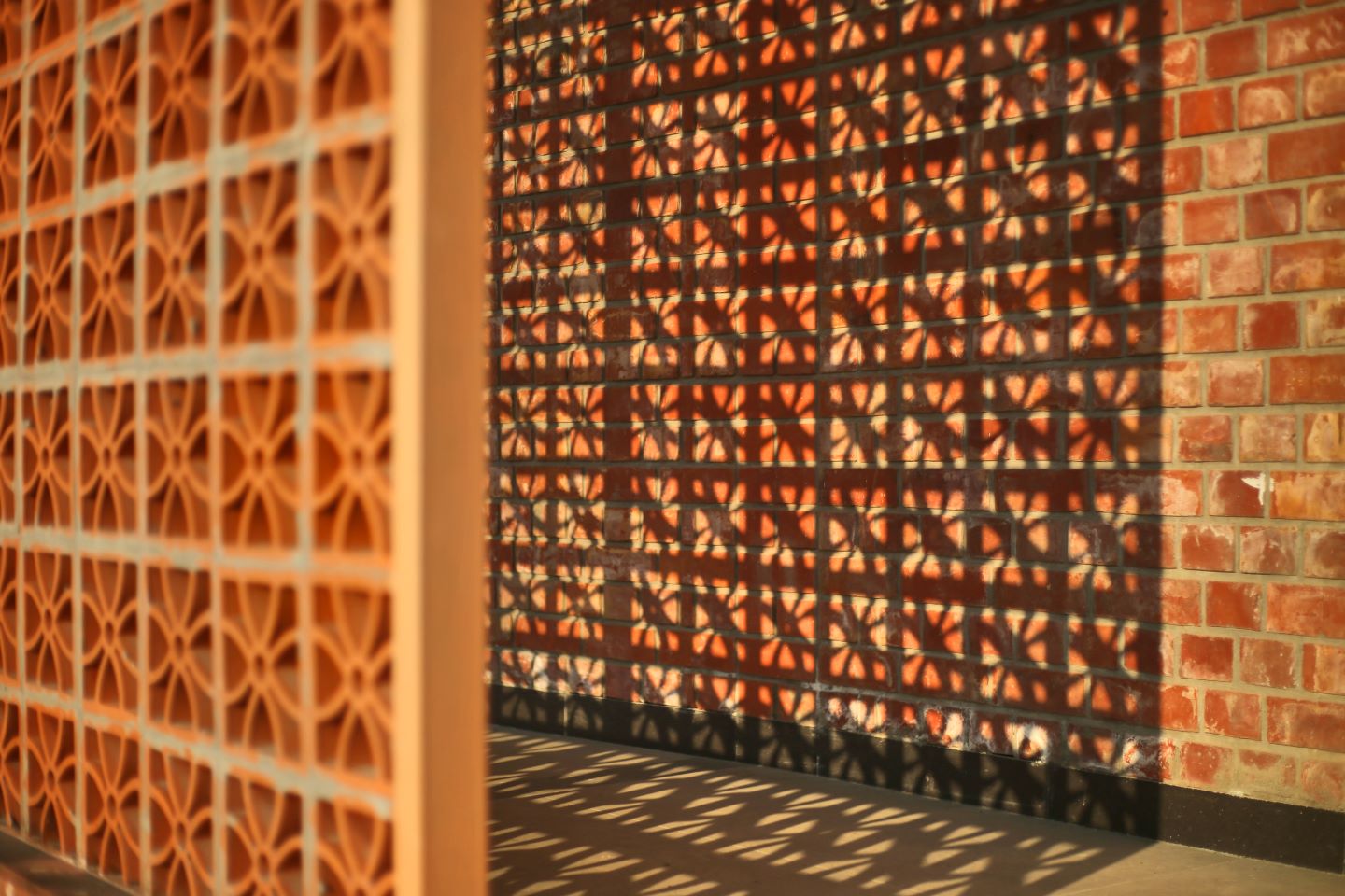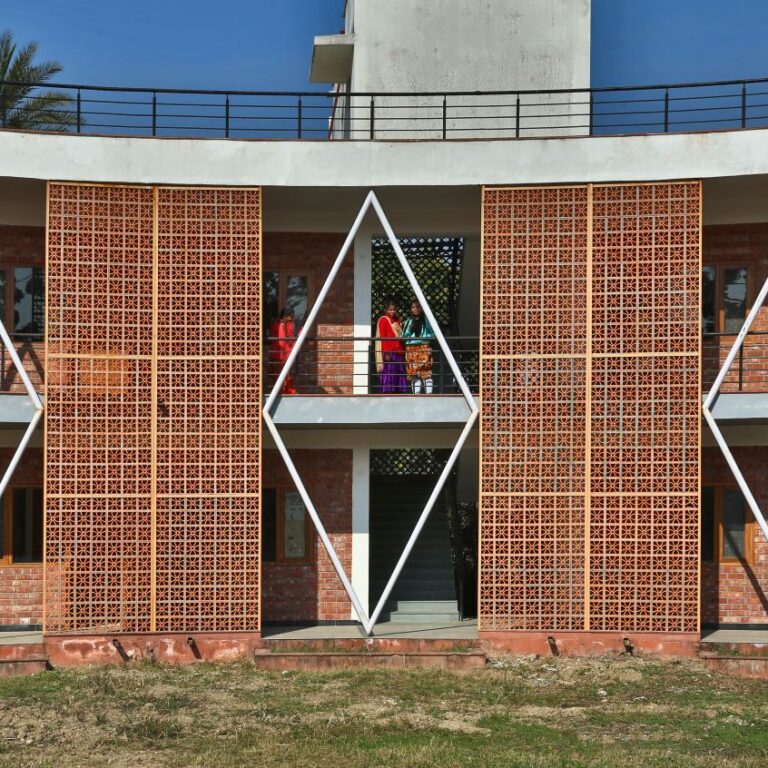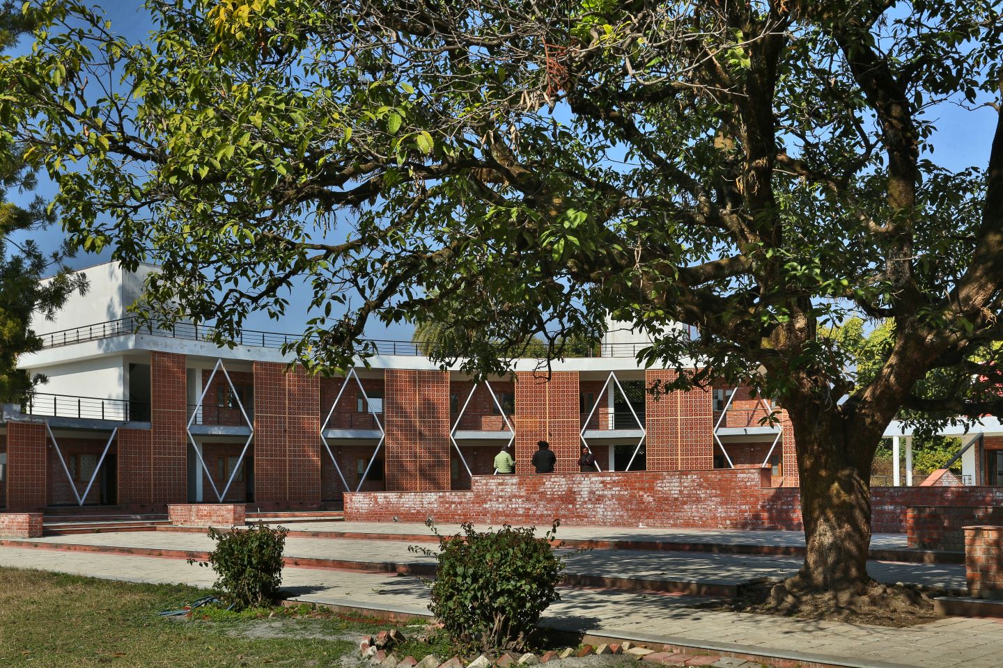 The building facade has perforated clay-tile screens and v-shaped tubular pipe sections, which provide a dramatic shadow effect in the circular corridor behind, naming this entire setup as ‘the walk of introspection.’ The contrast of white with earthy tones, bolsters the harmony of the entire building-setting with nature, where the user can sit and tell tales of their youth and vigour, achieving solace in this communion of architecture and repose.
