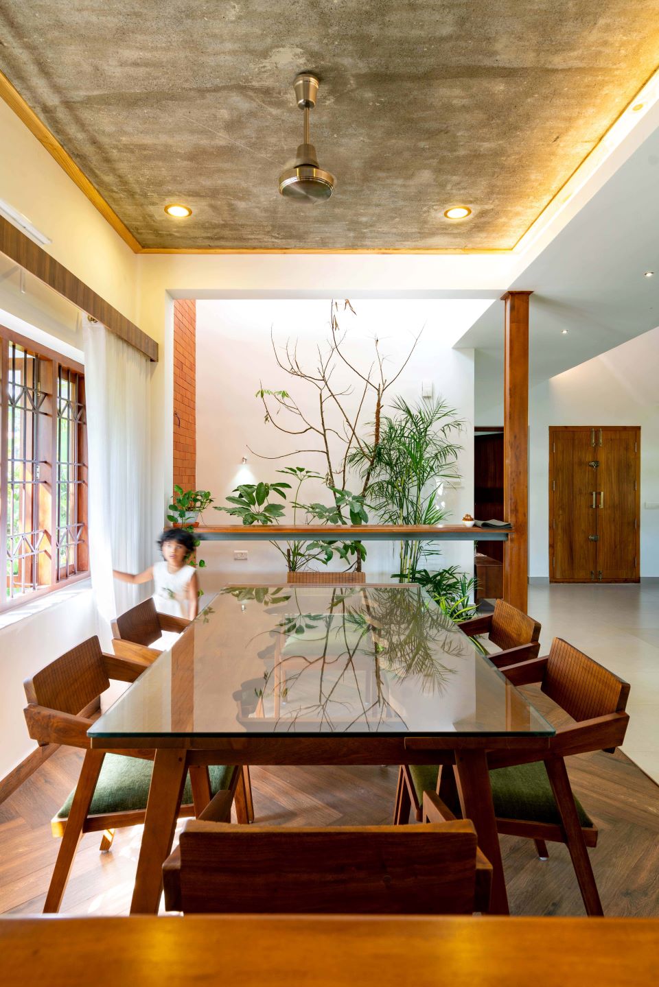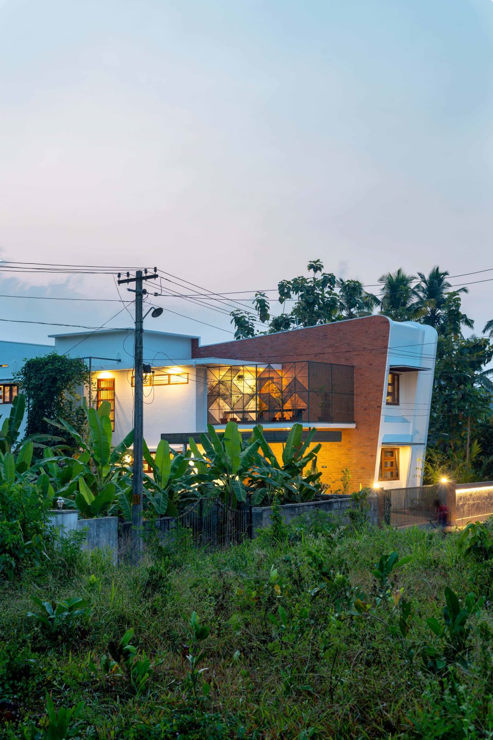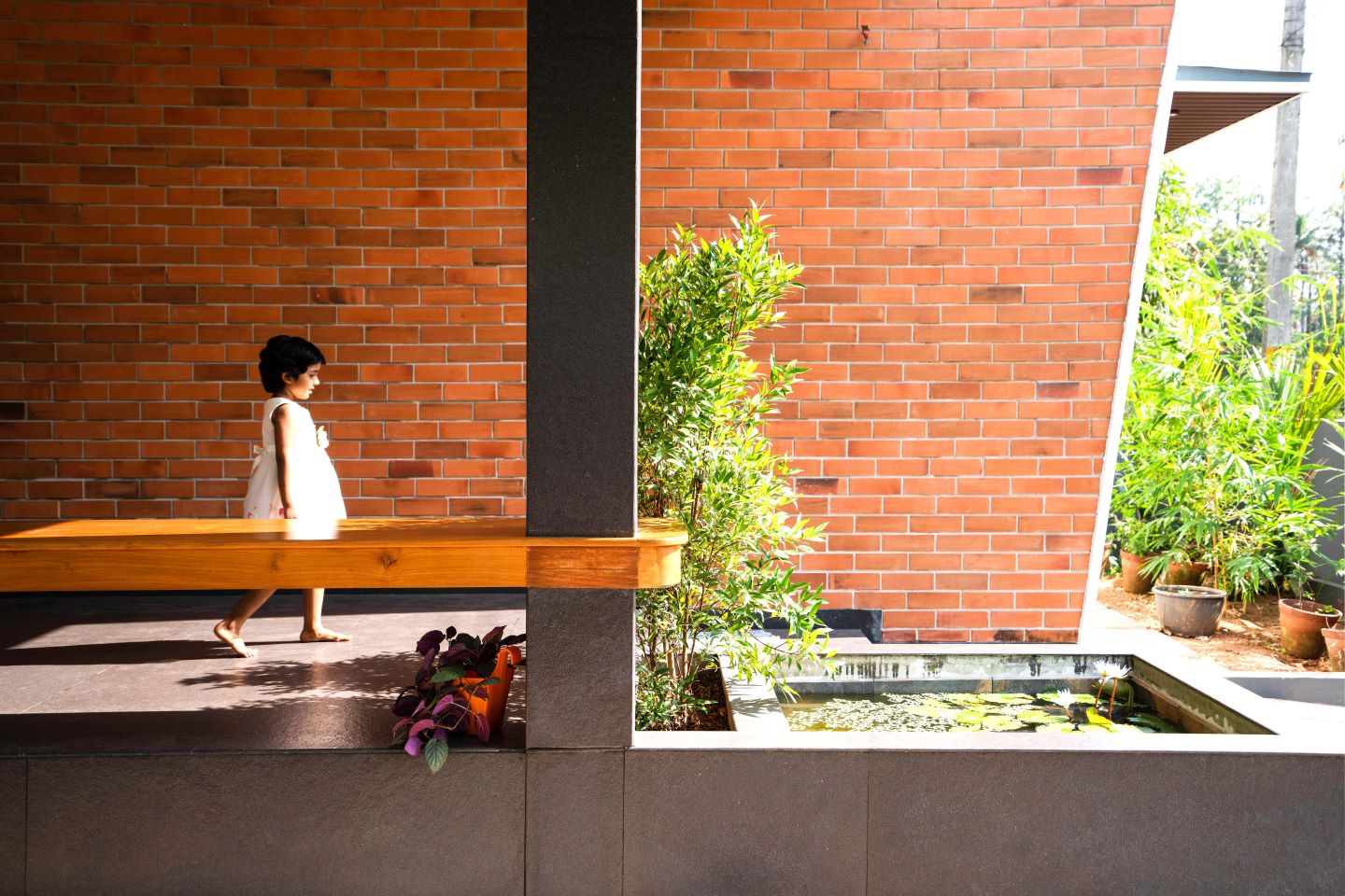A major highlight of the house is the slanted exposed brick wall which is designed to stand out from the context, yet giving a tropical touch to the residence. The design has also attempted in bringing nature inside, both with the use of contextually detailed skylights and the jaali which is the breezeway that facilitates natural cooling of the interiors. This is complemented with a distribution of internal gardens and pools that work together to bring in a magical play of light.