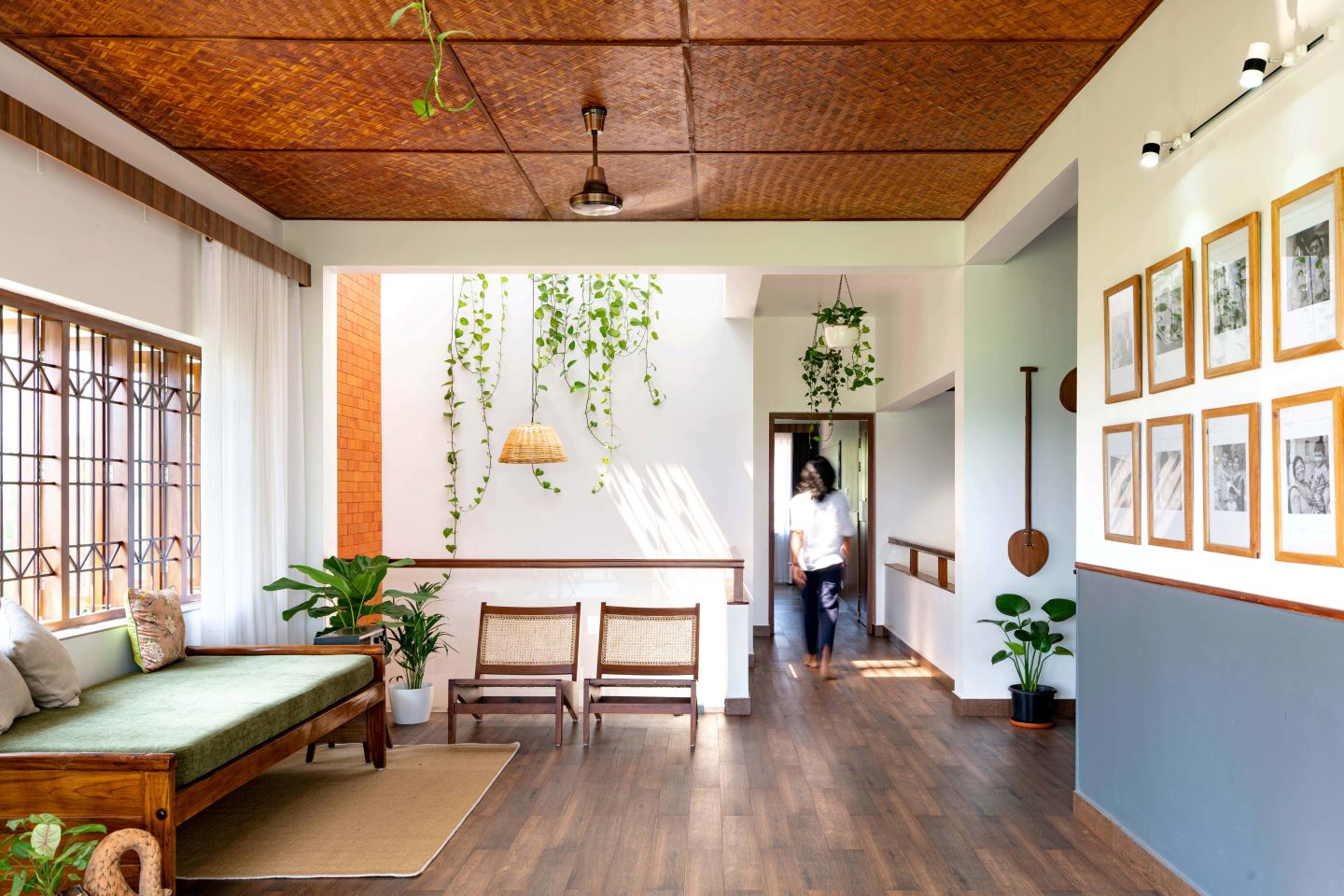 The architects have deliberately planned the massing of the house by differentiating the public and private areas. Ceiling volumes and textures were used to create zones in the whole structure. “The internal connection is increased by connecting floors through all the open areas which is spread around the plan. Although the site had its own linear footprint and limitations, the movement pattern of the house starts and ends with open spaces in all directions,” explains Nancy.
