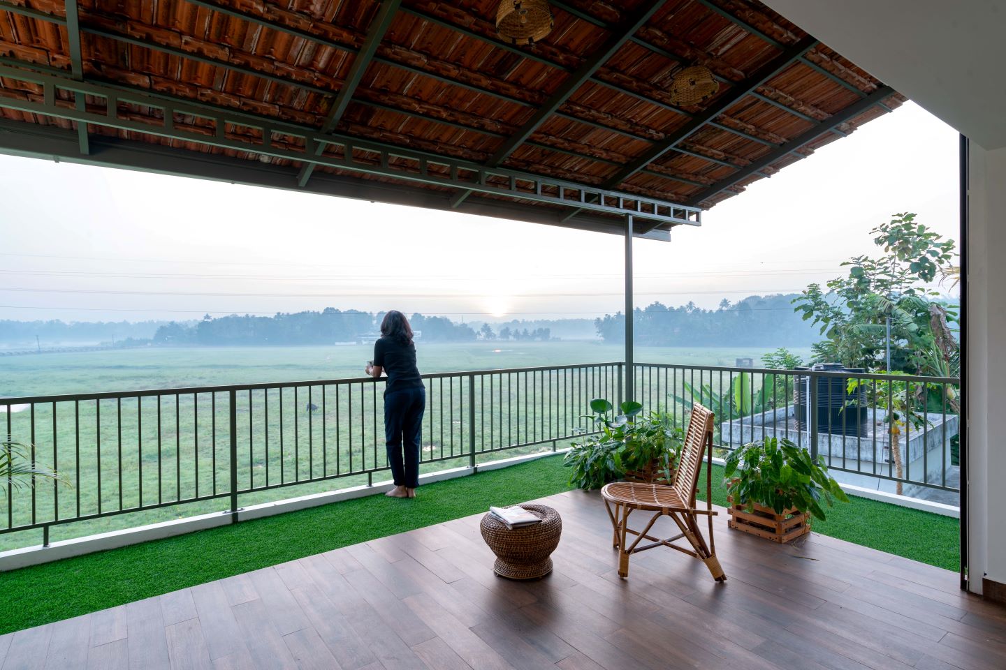 “Utilising the vast field in the rear side was one of the primary decisions made while designing this project,” says Nikhil. “The major challenge was to bring the green paddy fields right into the house, keeping the privacy for all the bedrooms intact. Bringing in maximum daylight and keeping all the spaces ventilated was another important criteria,” he adds. This was sorted by providing large openings facing the paddy fields along with a large balcony with automatic rolling perforated shutters. During the day ample wind and light enters through all the openings, while at night the rolling shutters can be closed and locked providing privacy and safety to the clients. Wind still escapes through the shutter’s perforations. Stack effect (for ventilation) is also provided inside the house for hot air to escape, making the house cooler even during the summer months.