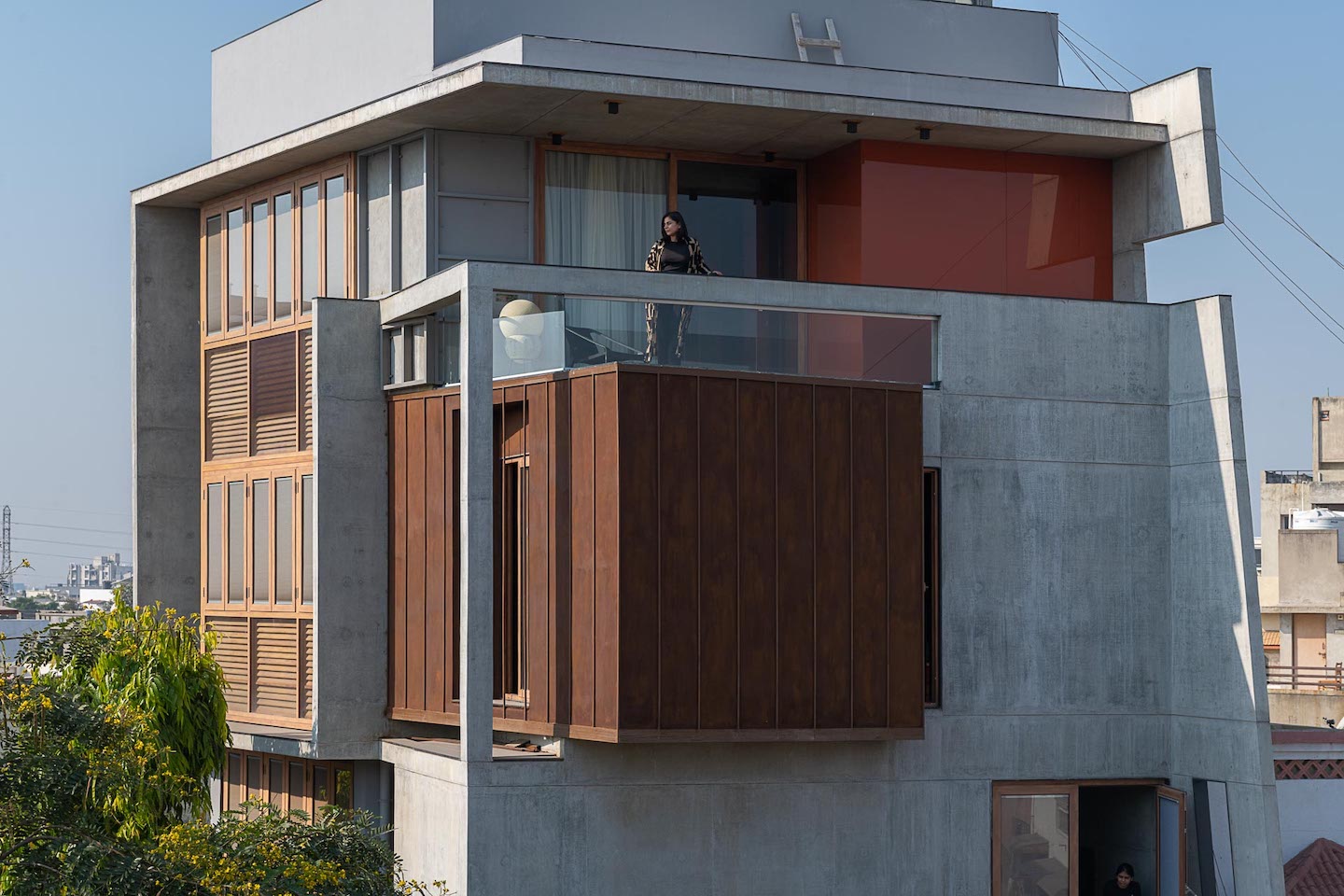 Thoughtful details in mild steel, local kota and black granite stone, teak wood and glazed ceramic tiles against the exposed concrete walls elevate the living experience. Surprise pops of colour in the stairwell beckon you upwards, further playing on continuation and seamlessness of space. Vernacular elements like a hanging bed, an Indian diwan seating, a modern jharokha infuse the spaces with nostalgia.