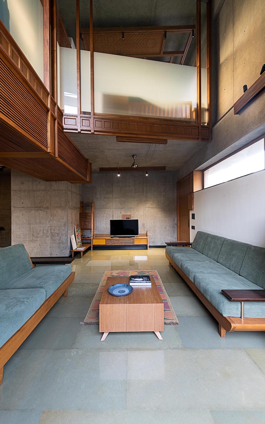 The double-height living room belies the compactness of the footprint. The bedrooms on the upper level overlook this volume through a modern jharokha-like detail. Frosted glass expanses ensure privacy to the private spaces.