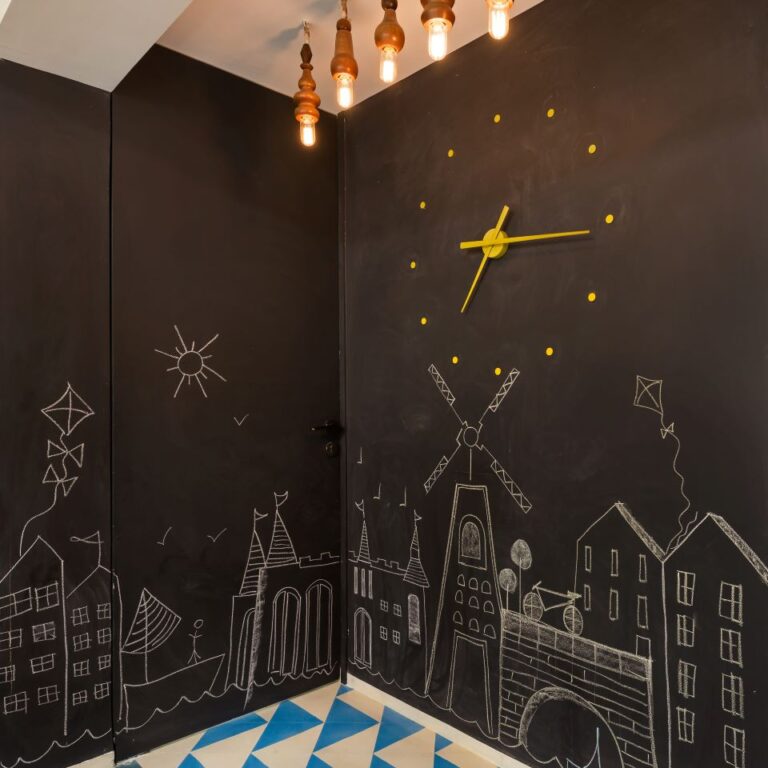 The most used area of the apartment is also part of the living-dining space are the two of the back walls which is converted into a chalkboard painted wall. “The family takes pride in sitting with their little daughter every evening to draw and play and spend some quality time together. Alternatively the couple also use this wall to write messages to each other,” informs Nishita.