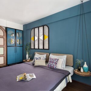 In the master bedroom antique distressed finished cupboards in mint green, a louvered window and a stunning swing side table crafted from a cut section of a tree trunk are set against a blue wall, making this room fun and vibrant. The guest bedroom on the other hand is simple. The highlight of the room are the ombre cupboards. The cupboards are divided by a bed with a tall headboard and book shelf.