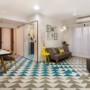 The large living and dining room is bright and welcoming, and has some unique design elements which leaves a lasting impression. One of the most striking feature of the living-dining room is the pop-hued flooring — a handmade cement tile which is locally produced. The tiles helps reduce the temperature of the flooring, and makes for a cool surface to walk on; while the distinct colours add an element of fun. The same flooring continues into the kitchen to make it look like a large seamless space. To offset the flooring, the walls and ceiling were kept muted to a white.