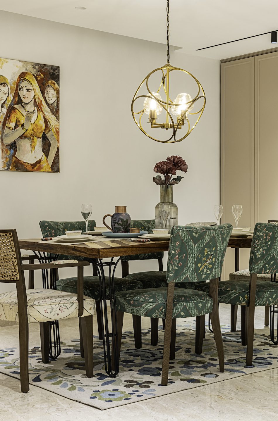In order to keep the apartment airy, and tie in to the theme of modern Victorian, heavy-duty furniture and visually cloying materials and colours were kept at bay. For example, the home-office, has an opulent study table, a modern day-bed, all enveloped in a white, mint-green palette, and peppered with additions in walnut and gold. The living room imbibes the Victorian look, in white and neutral shades, a sapphire-blue sofa, sage-green armchairs, and gold accents. Meanwhile, the sand-coloured Duco that is the accent TV wall brings in the modern vibe. Materials such as marble, veneer, fabrics, and paints, all echo the theme of modern Victorian.