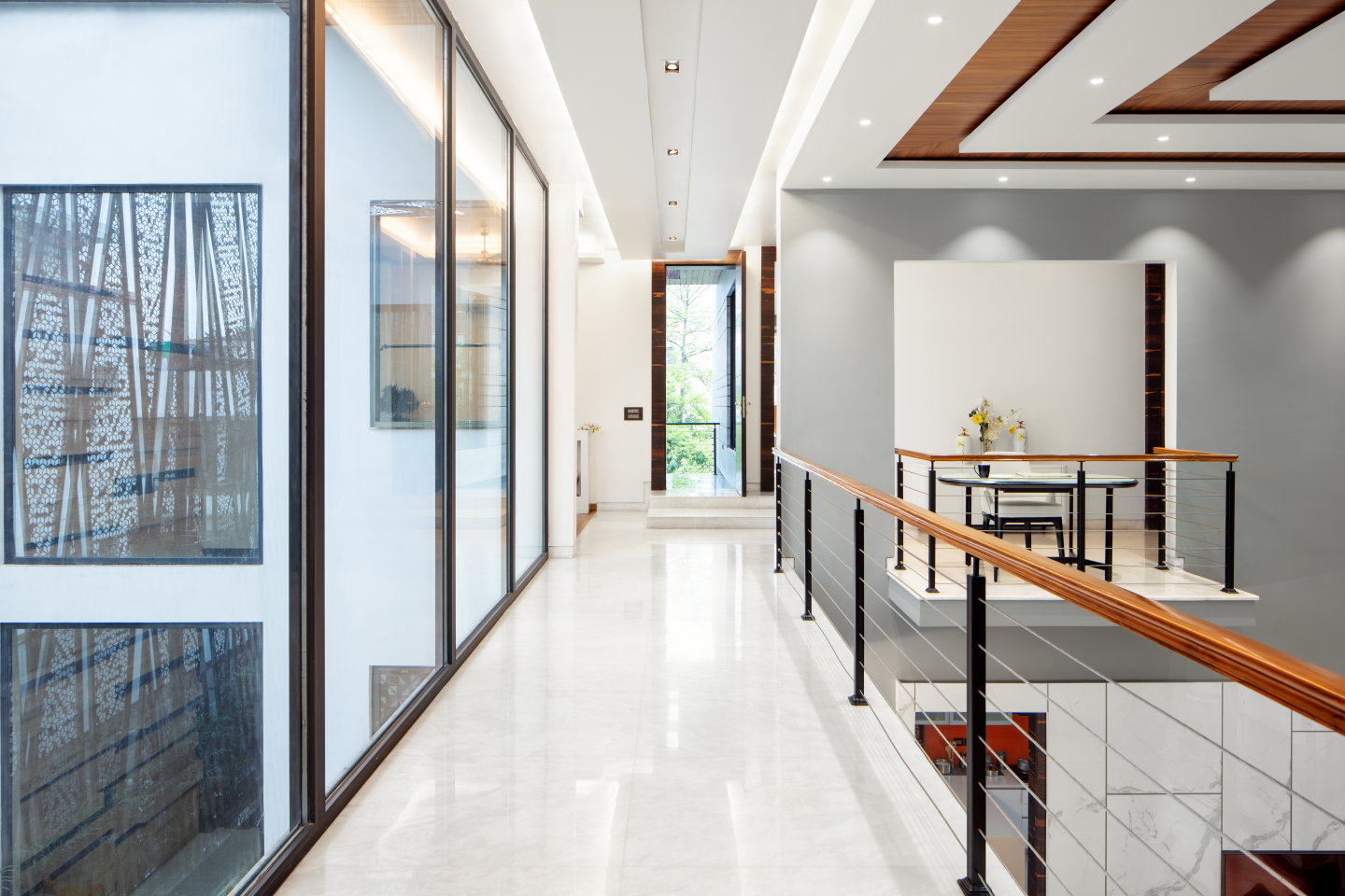 A series of connected living spaces, courtyards, and bedrooms were planned with the intent to create a home that could be brought to life throughout the day. Similarly, the cantilever slabs spanning the verandah, render a modern aesthetic while creating shaded spaces underneath. The geometry of the cantilevered forms is such that it aids in externalising rooms and maximising space, serving not only aesthetic but also functional purposes. Spaces are fluid and interwoven, with interstitial spaces creating seamless transitions from the inside to the outside. As one is led into the house through the double-height lobby on the east-facing entrance porch, they are pleasantly surprised by the garden’s view with a water body. Bringing the exterior environment inside, by providing green areas in the interior spaces, establishes a strong visual connection with the outdoor landscape.