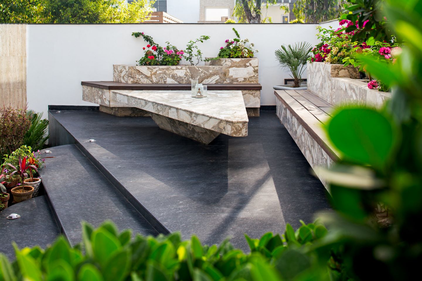 A quite corner in the front of the landscaped area of the house has a sit-out made from natural stones