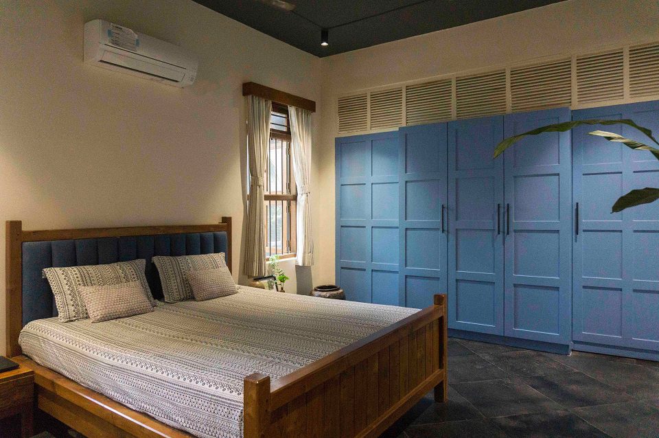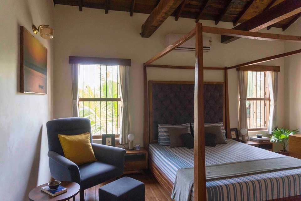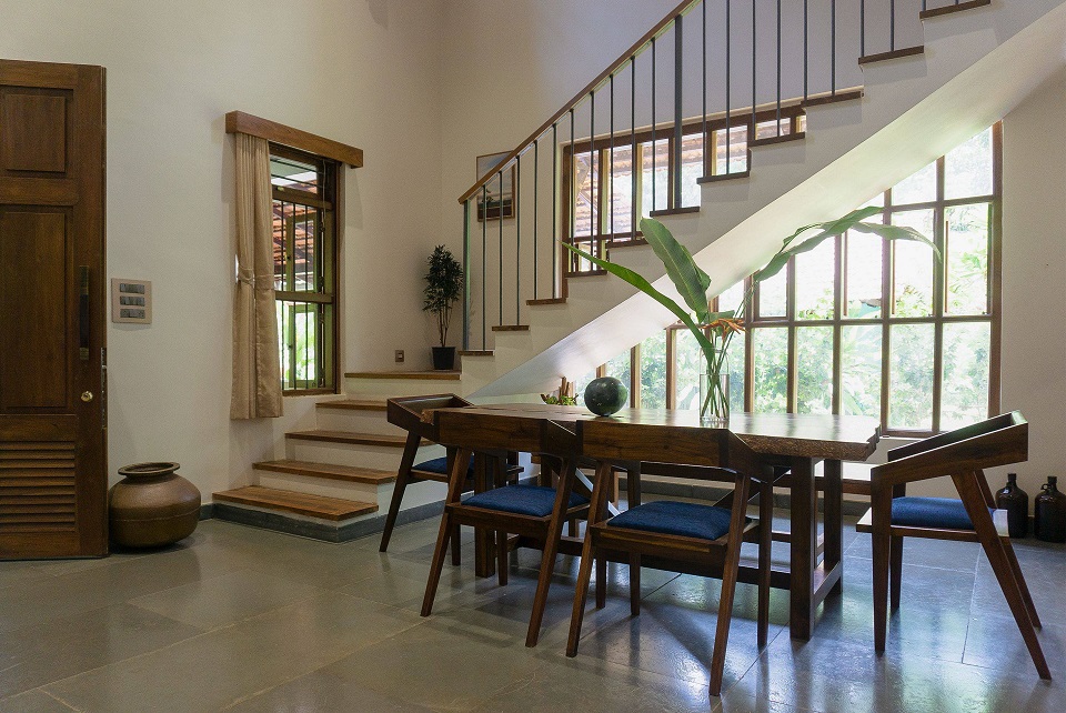 Studio 415 has used locally available materials, which also form part of the colour palette of the home. While the frame of the house is of RCC, the walls have been built using locally manufactured and highly recyclable laterite stones. The framing of the roof and the flooring of the first floor, too, have been done in locally available wood. Meanwhile, the furniture has been crafted from teakwood. “We have made maximum use of sustainable elements in building this house. The theme of the house is simple yet elegant, and is characterized by minimal interiors and art pieces,” says Tejas Yelve, who helms Studio 415.