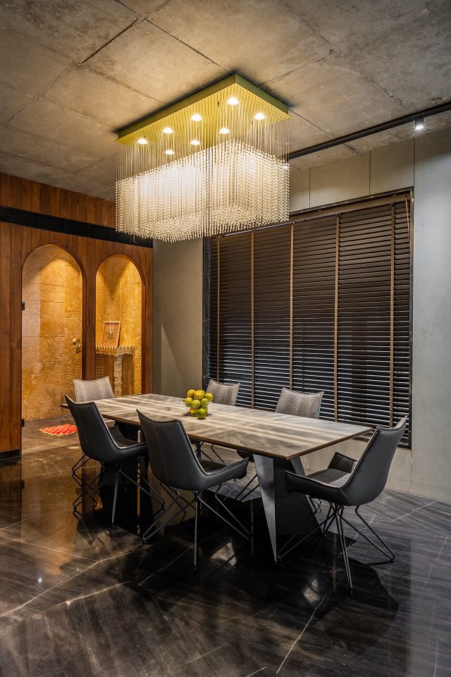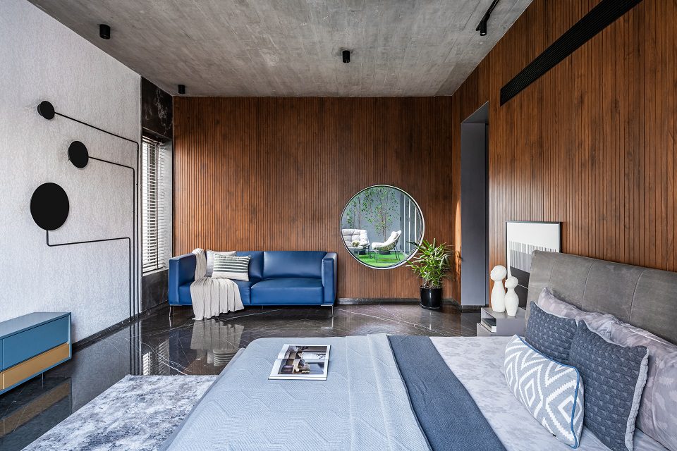 Polished wood and high-gloss stone surfaces are juxtaposed against the exposed brickwork and RCC combination. Infinite Frames’ public spaces have been accessorised with autumnal-toned furniture in conjunction with earth-coloured ones. Meanwhile, the private areas show-off a colour palette combining bright, warm, and cool shades, expressed by a variety of imported Italian furniture, wall claddings, and paint work.