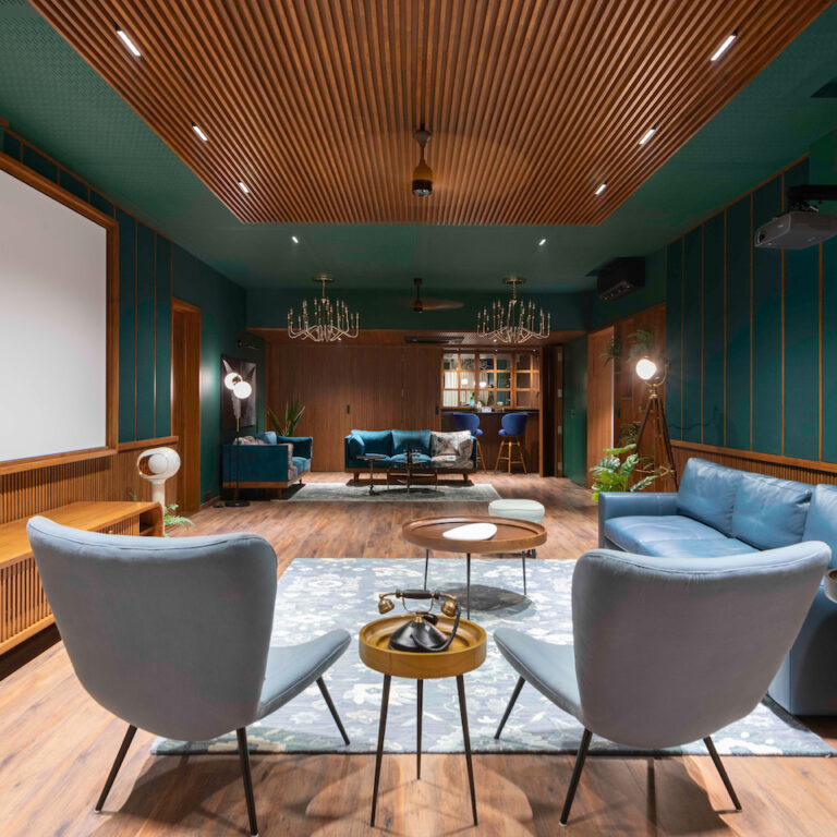 The home-extension also meets the emerging inevitable need of a home office, “which the client has been thoroughly using in these testing ‘work from home’ times,” reveals Gauri. The vintage ambience, rendered in salvaged teak wood panels complemented by hints of beige through lime-plastered walls and crisp furniture selections, recreates the ambience of an office space of the 1970s.