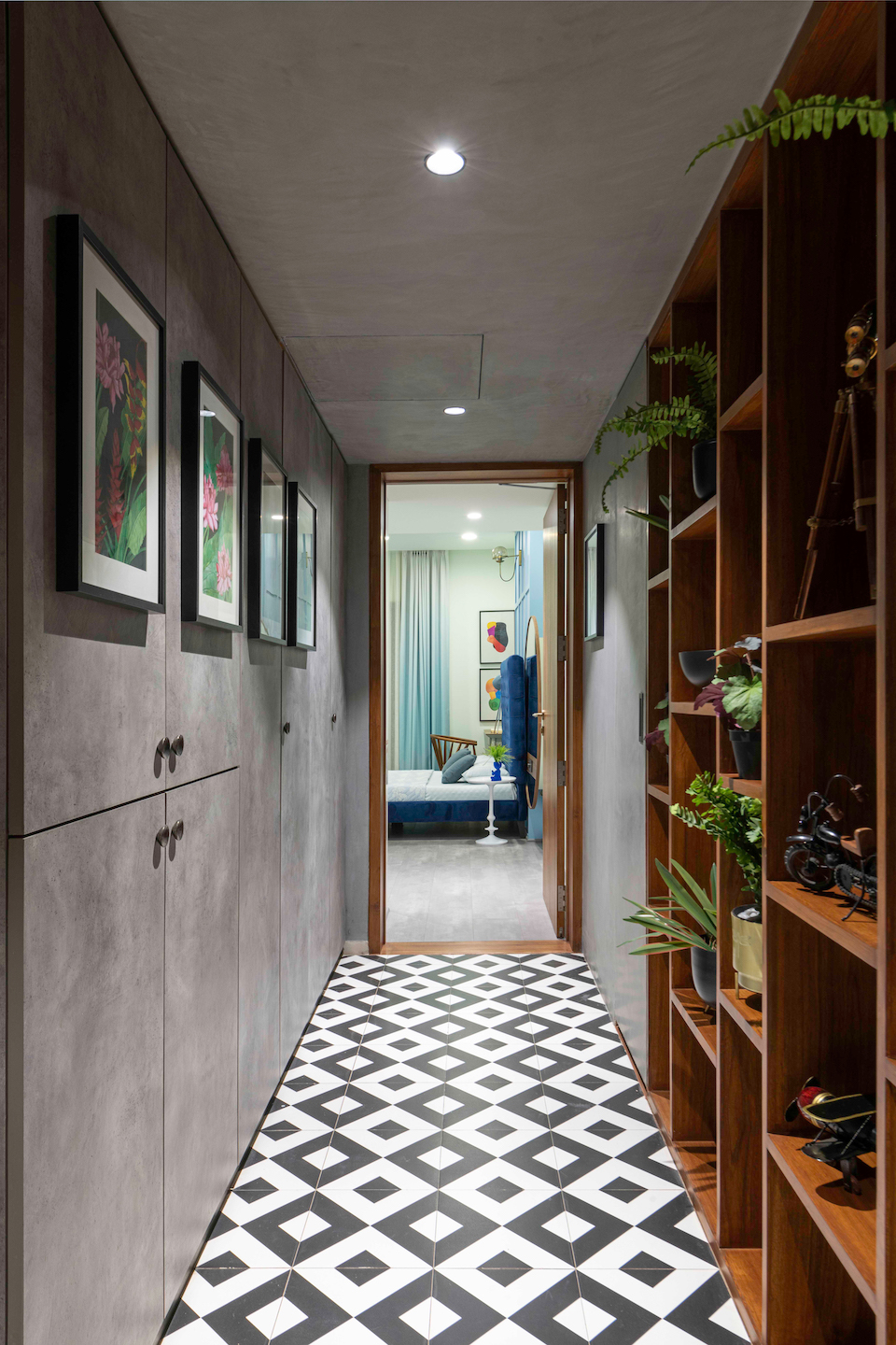 The site was received as a shell, “that being its strength, we could alter the layout to suit our requirements,” reminisces the young architect. “The apartment, being an extension to the main home, did not need a kitchen. So we amalgamated it into the living lounge, accommodating a hidden bar and a powder room. The door entry to the guest bedroom were altered to add an extra low seating near the bar.”