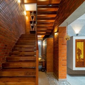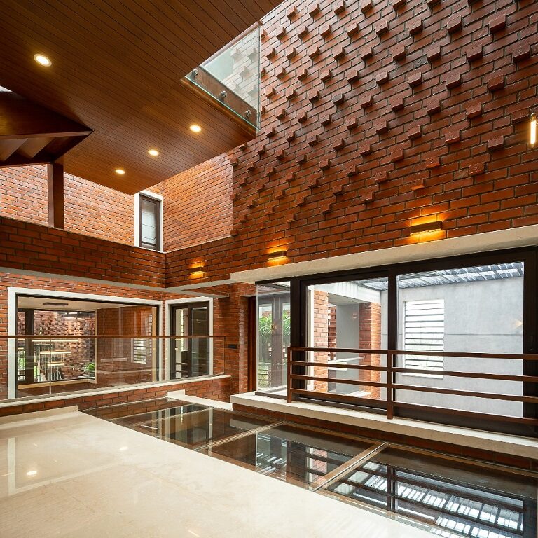 Set in lush surroundings, Vinod Residence in Coimbatore, designed by Murali Architects is spread across a 2,400 sq ft plot, with a built-up area of 6,000 sq ft. Privacy, without compromising on light, ventilation, and space, was the main concern of the client. This lead to an introverted house plan, with a contemporary design, and a traditional material, the wire-cut bricks, applied to facades and interiors, in a novel usage.