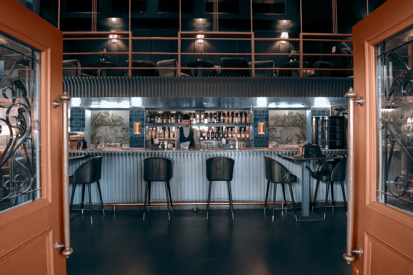 A tropical mural which is spread across a 100-feet-wide facade makes a bold statement, and announces the eatery and terrace bar in the busy and bustling shopping mall. Once inside, the property is lined with fluted wall panels that contrast with the existing contemporary site profiles. These blue ribbed wood panelling is fragmented with geometric arches and colour. The handcrafted modern arches along with vintage artwork and paintings compliment the signature Havana theme. A burnt orange hue lights up the atrium which opens up into a double-height stairway that leads to the spectacular terrace lounge and bar.
