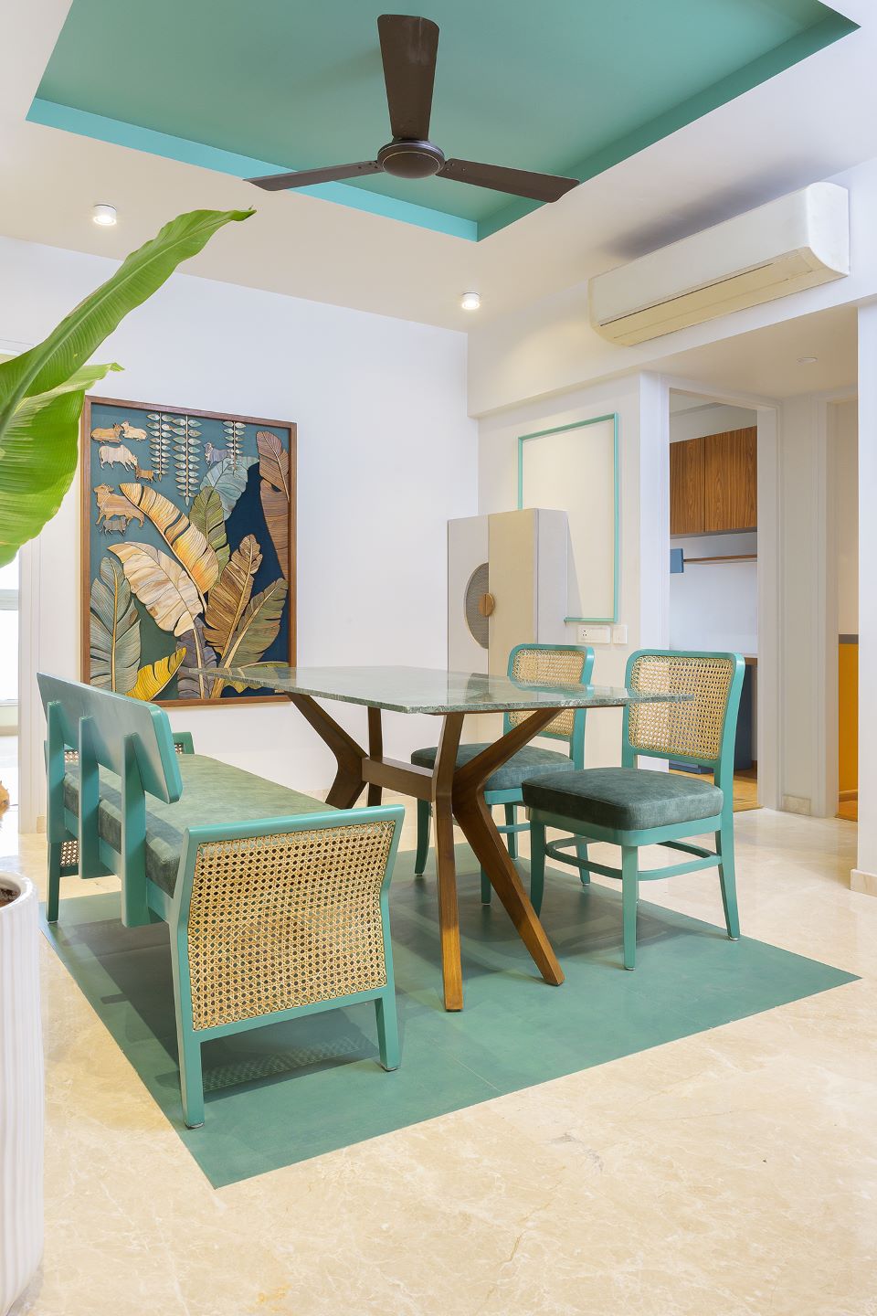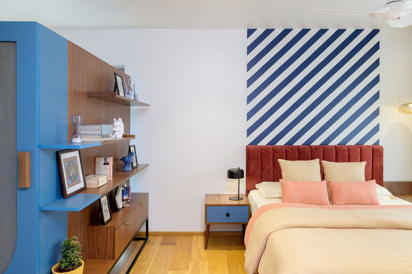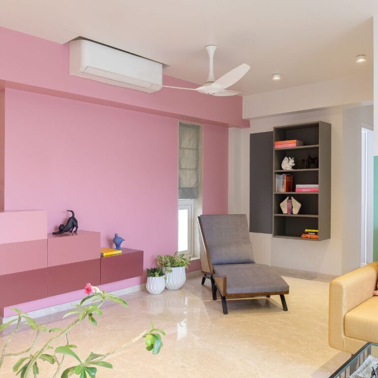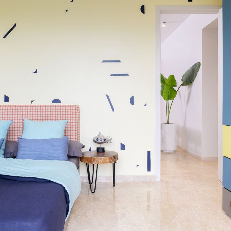 Project Hide N Seek designed by MuseLAB is nestled in a quiet gated neighbourhood of Vikhroli in Mumbai. This apartment is an amalgamation of two 2BHK units which differed in planning and could be connected only at one point — where an existing bedroom shared a wall with the living room of the other apartment. The apartments when connected stretch the breadth of the building. The client’s brief was simple: they wanted a spacious 3BHK apartment with a study, and that the apartment should be colourful and pet-friendly.