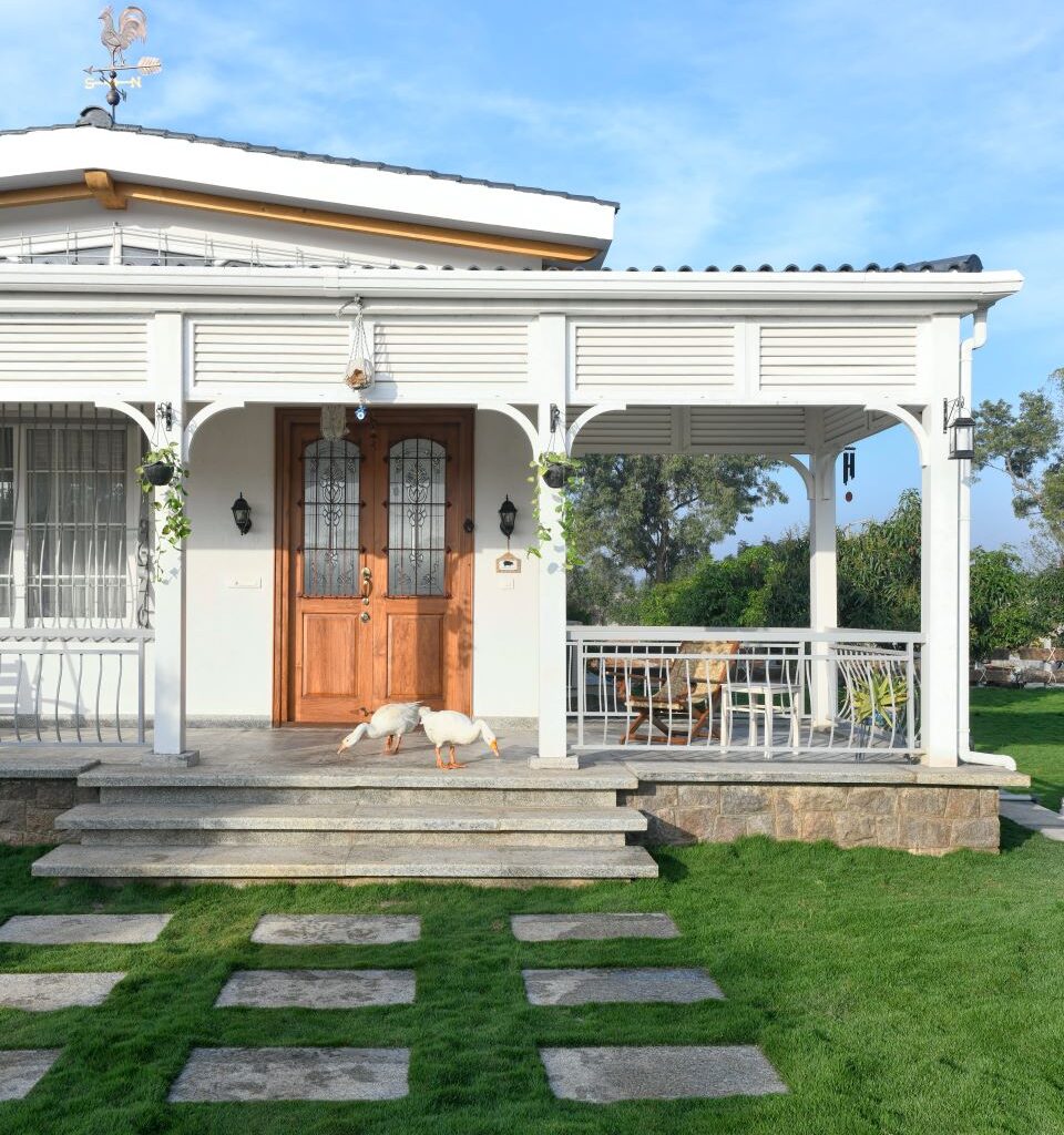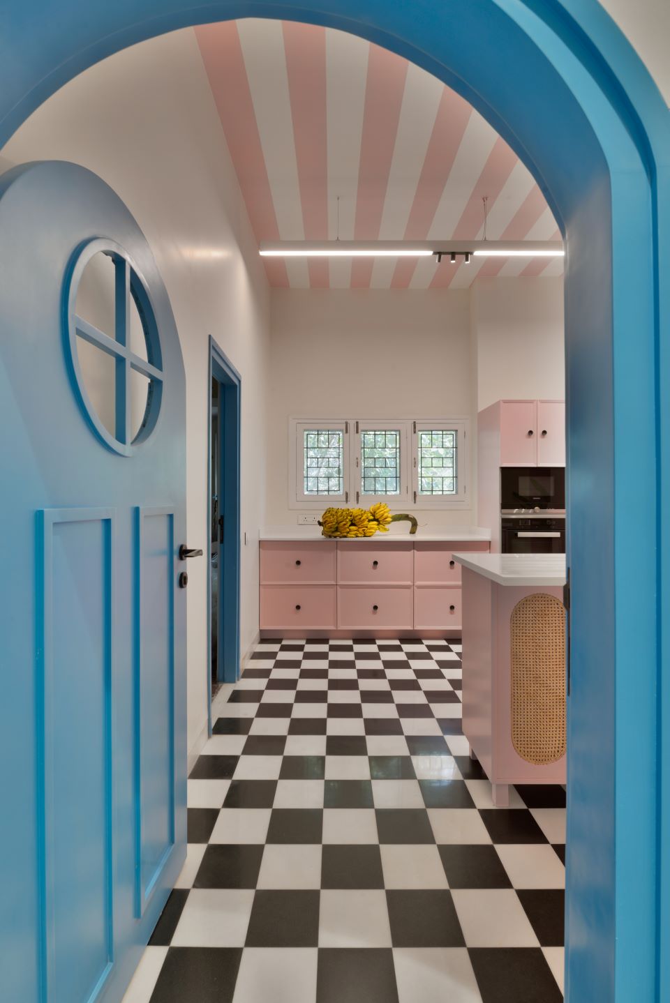 Tinkerbell Farmhouse an English country-style farmhouse designed by Keystone Design Studios is located outside the city of Hyderabad. The farm animals certainly approve of the architecture as they wander about the front porch!The Circus House, a creation of Sona Reddy Studio, definitely keeps those lockdown blues away with its cheerful interiors. The kitchen doors here have a Shire-inspired frame.Detail of the brick work reflected in the water body of the Brick Mask House designed by Spacefiction Studio. Located outside Hyderabad, it’s the perfect hideaway amongst mango orchards.