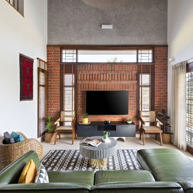 As for materials, the true finishes of brick and concrete are used in harmony throughout the areas, binding spaces together and rendering a vernacular look to the house. Italian marble, cement tiles, solid finger joint sheets and vitrified tiles was used for flooring in different spaces. The flooring define spaces, and acts as the perfect backdrop for furniture, furnishings and decor accessories.