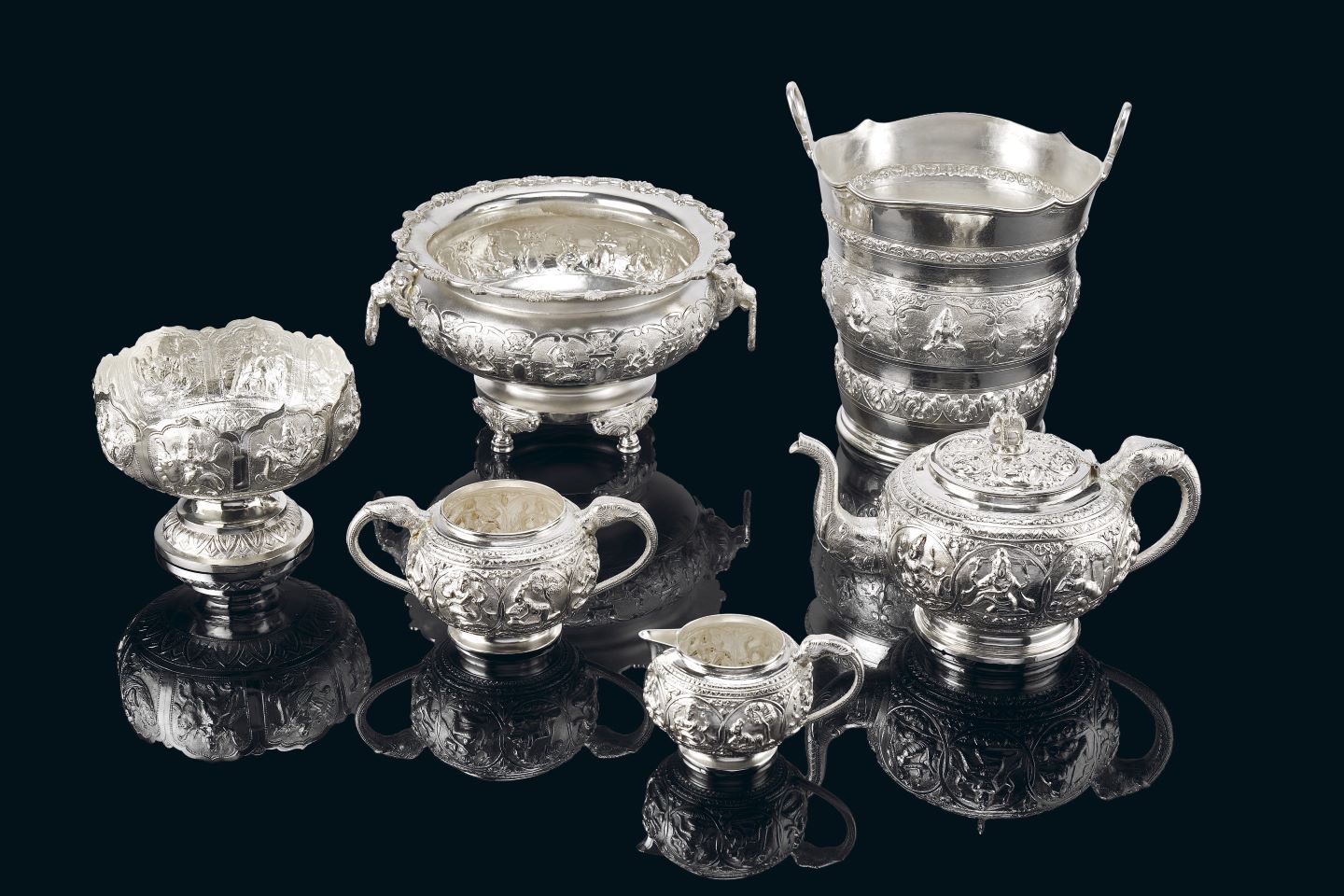 The silverware includes a beautiful selection of fine hallmarked pieces which retraces the deft metalworking in India and Europe in the bygone era. Creations by iconic silver manufacturers of the 19th and 20th century including Hamilton & Co, Hunt & Roskell, Mappin & Webb, and Carrington & Co will be showcased. The collection is made of superlative quality classic silver period pieces including tea sets, trophies, jardinières, flower vases, candelabras and centrepieces. Several of these lots were executed over a century ago.