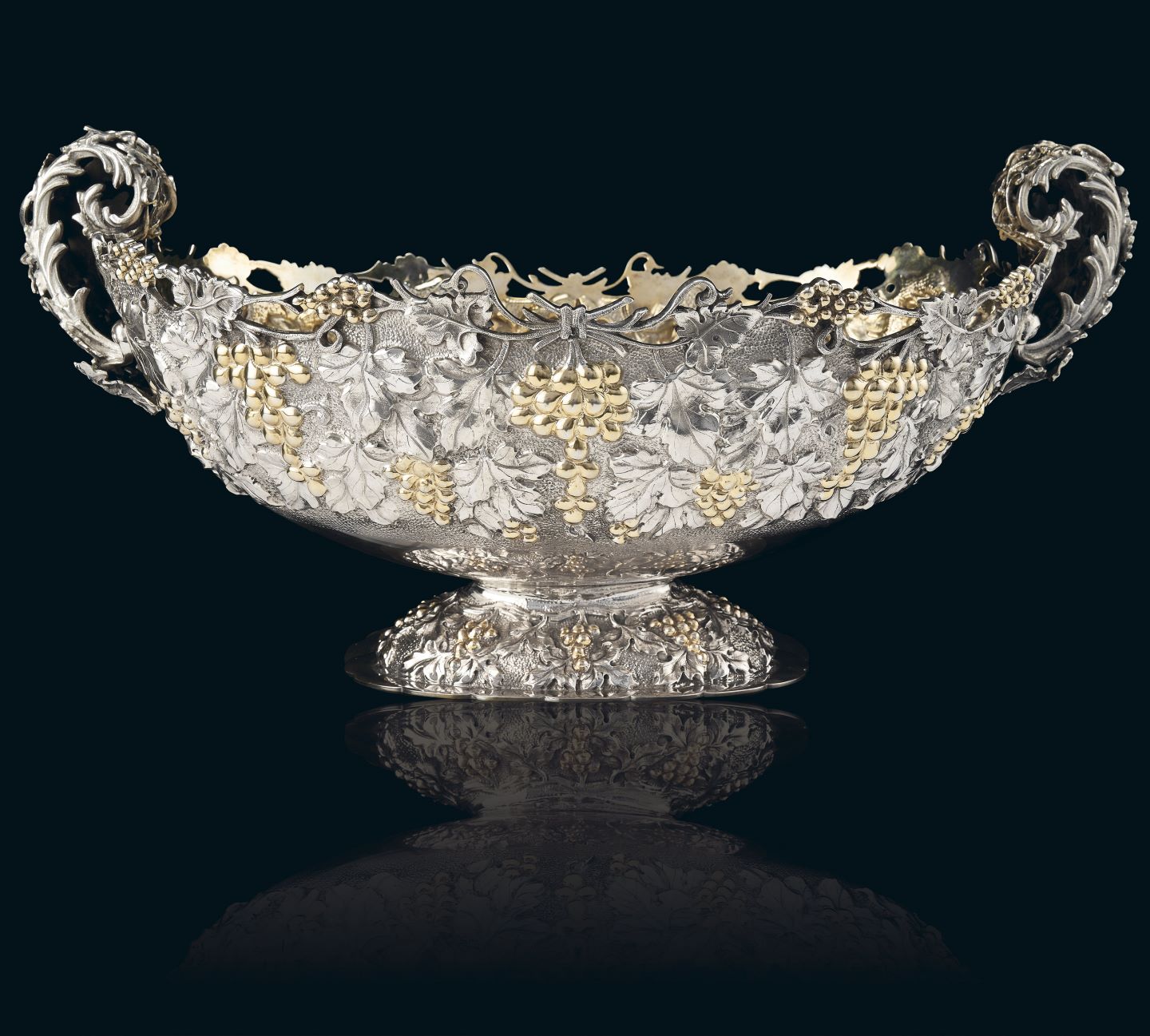 A large antique centrepiece accompanied with four crystal bowls (one large and three small). The three crystal bowls on the side are attached to the centrepiece with elongated handles, with deftly executed seahorse figurines. The crystal bowls can be used for a flower arrangement or serving fruit. Created by Horace Woodward in 1874, this antique silver lot no. 59 will be offered with an estimate of Rs 6, 75,000 to Rs 7,50,000.