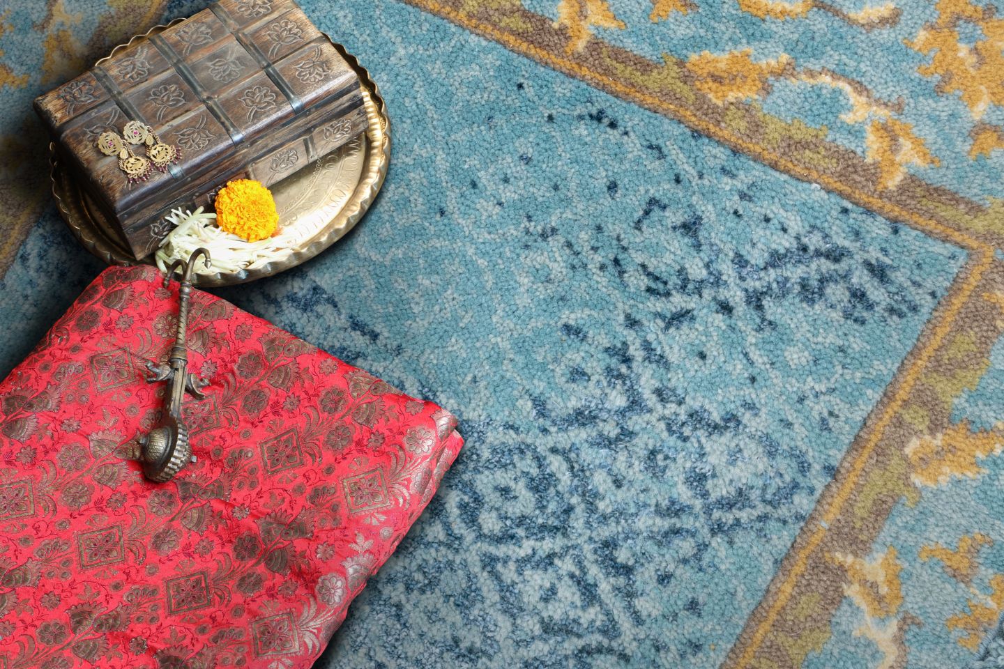Obeetee’s Puja Collection comprises of diverse and beautiful designs inspired by Indian motifs. It is a collection where Indian aesthetics blend seamlessly with modern designs giving buyers the perfect art blends to adorn their homes. The series comprises of Aaradhna, Meera, Upasana, Aman and Seher range of rugs. The Aaradhna Collection is based on miniature paintings from north-western India. These are simple compositions made using subdued tones to retain the essence of the art form. Flowers, which hold immense spiritual value in Indian culture, are incorporated in the carpets to create a spiritual connection.