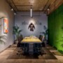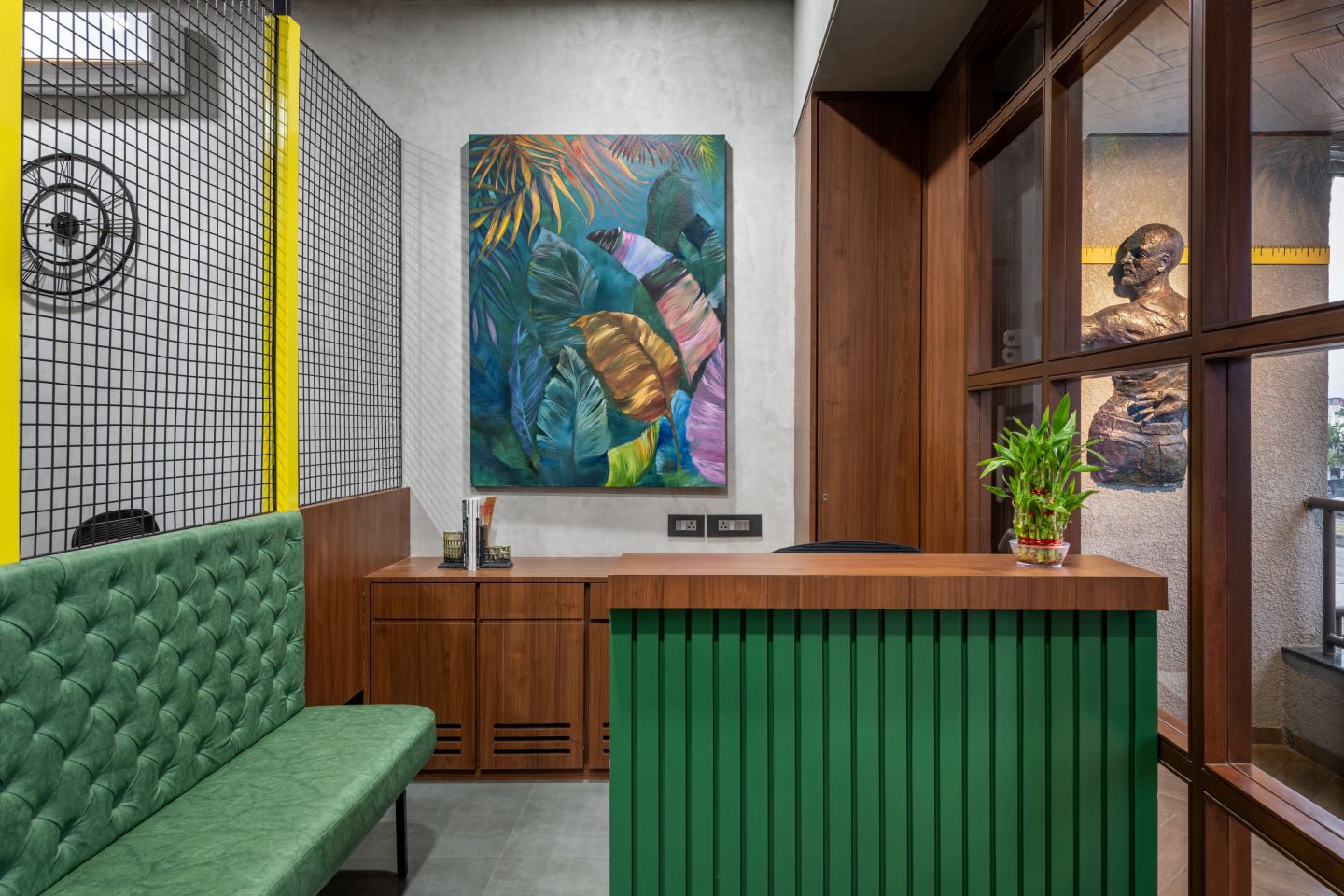 A contemporary design style filled in with green, grey and yellow was the design team’s chosen path when it came to embodying a space that would encourage creative thinking. The entrance foyer is planned through a balcony with landscape and wall mural denoting the meaning of bilaang — an ancient unit of measurement. A full-glass partition and door allows ample sunlight in the studio from the balcony, while the metal mesh divider placed between the staff and reception areas ensures adequate light and ventilation to the interiors. The cabin is placed overlooking the staff and reception area, which enables functional connectivity of the office. The conference area has been planned with a green wall, raw ceiling, planters and artwork, crafting an ingenious and creative vibe. All partitions and the cabin backdrop showcase geometric lines. In the latter, the grid-like pattern is broken by a surfing board-shaped element that also accommodates the logo of the firm.