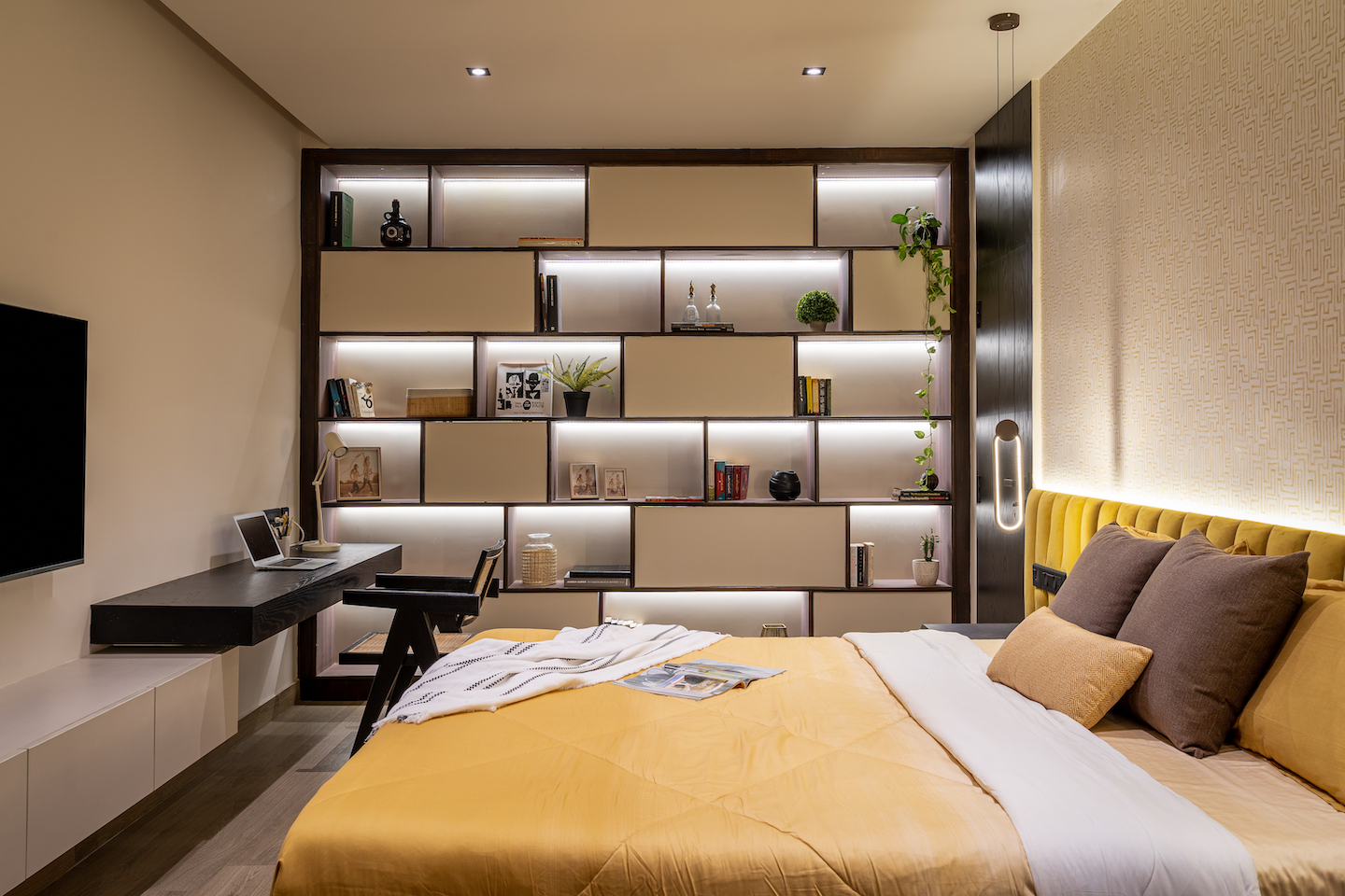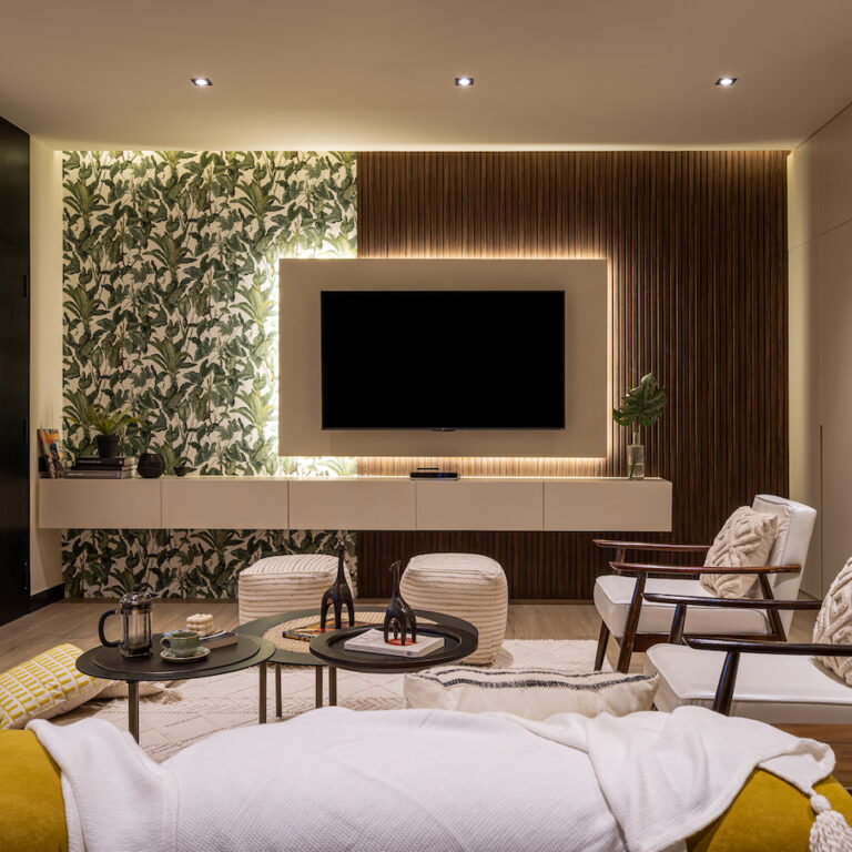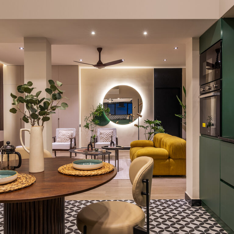 Colours, patterns, textures and finishes were used in a layered manner to create a nuanced living environment. “We opted for light wood for the flooring of the living room and the master bedroom to make the spaces feel lighter and more airy,” says Sushmitha. “We played with neutral tones of beige, green and yellow all over the house tied in with touches of black and walnut wood shades.”