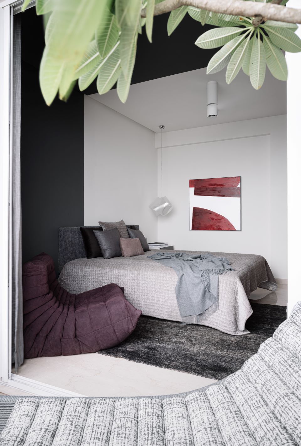 Charcoal and cream white are the dominant colours in the son’s bedroom —  the charcoal band wraps from the west wall across to the east wall where it provides a backdrop for an interesting shelving system. Positioned asymmetrically between the two tones is the floating bed. A two-tiered taupe coloured shelving system hung by deep burgundy leather straps, a Cristina Croce designed Gemmy Prisma Lamp, abstract art from F+S Foundry, and a relaxing day-bed under the canopy of a Temple Tree are the highlights of this bedroom. In the master bedroom the walls are treated with the Louvre wallpaper by Armani Casa for its fine linearity and elegant grey. Complementing the set-up is bespoke art from the F+S Foundry. The Dream bed from Poliform in suede and leather finishes is the talking point of this room.