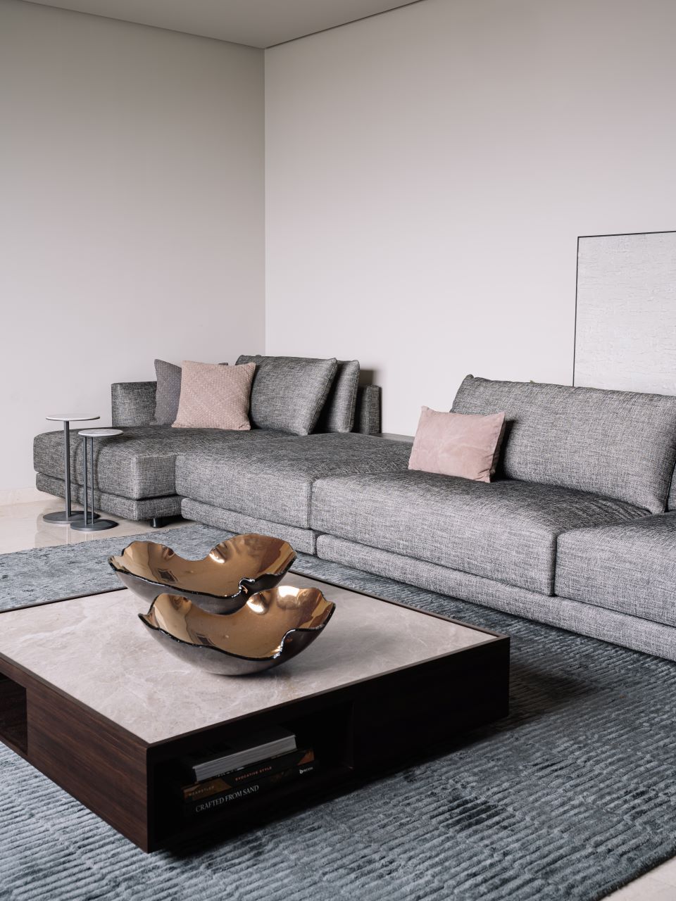 The living room is flooded with natural light streaming from the beautiful balcony attached to it. The angled architecture of the two gorgeous armchairs flank the luxurious curves of the sofa from Poliform. At the centre, an elegantly finished bronze coffee table adds visual weight and breaks the monotony with its circular form. Bridging the distance between the sofa and the arm chair are monolithic metallic side-tables. Suspended in the corner is the billowy stacked wood veneer Link pendant by Ray Power. The custom painting by Shamila Meeran from the F+S Foundry, in the background, ties the room together with its swirl of colours. A rug by Natuzzi completes the frame along with the luxuriant volume in the corner, a Raphis Palm.