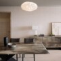 Once you step inside the house, at the foyer, a beautiful glossy ribbed metal console that reflects that colours around it meets your eye. It’s a great juxtaposition against the deep oak contemporary boiserie that camouflages the entrance to the powder room. The dining area and the casual lounging space with the balcony beyond is clad in La Velours wallpapers from Casamance that have a subtle interesting tactile feel, and complements the egg-shell hued veneer doors. The dining table is splendid — it has a crystal-art top paired with leather chairs making it a great combination with the dining console of the same finish. Suspended atop the dining table are the shimmering Tati Pendants designed by Arturo Alvarez. Bespoke art from F+S Foundry finds its place on top of the console along with an ivory sculpted stone table lamp. A bespoke contemporary swing has been positioned centrally between the dining setting and the balcony to facilitate members of the family to easily participate in a conversation whilst adopting various typologies of seating across the hall.