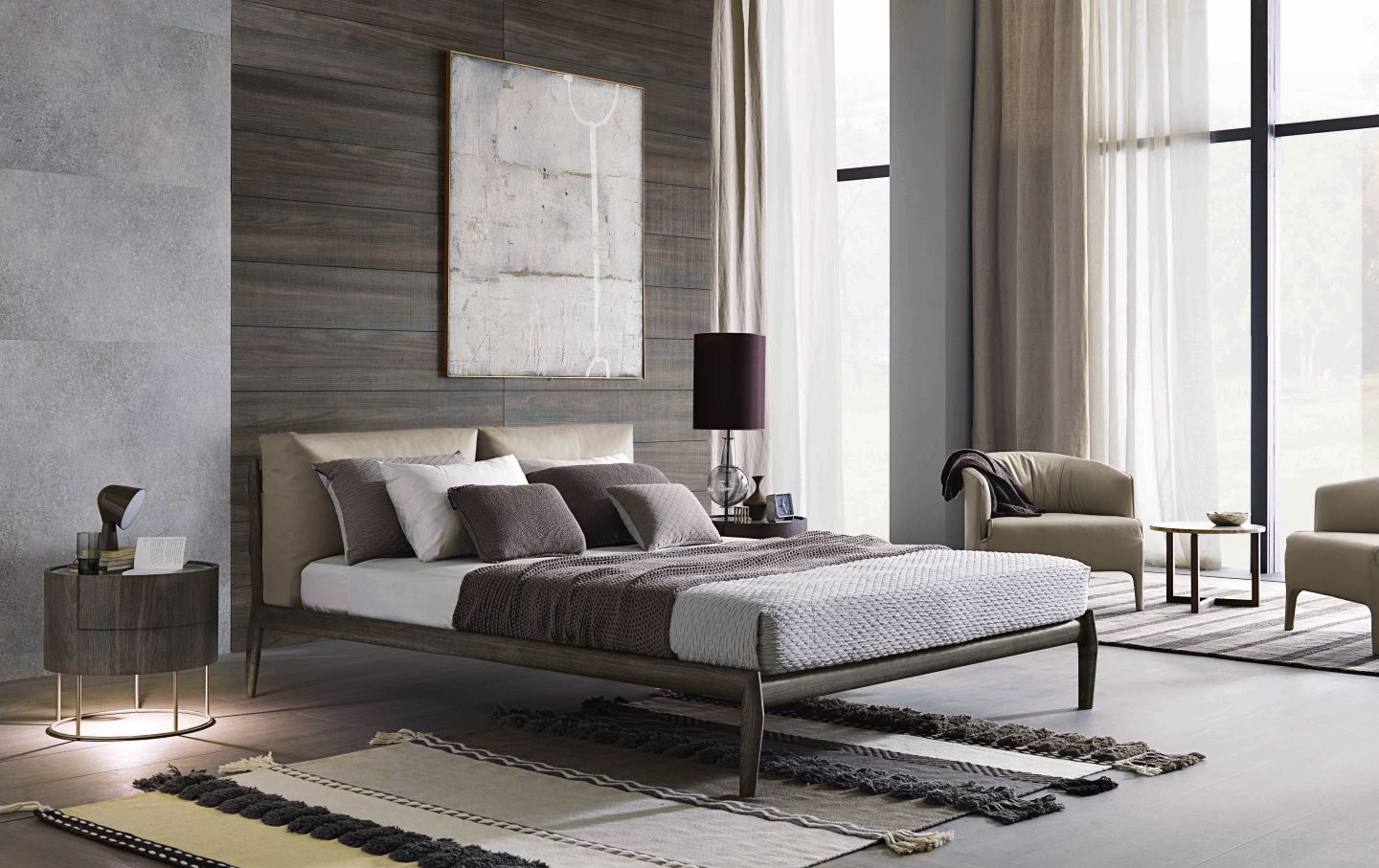 With a headboard consisting of two separate adjustable elements, Giorgia features a light curve that gives the sleeping area a delicate sign of style. Nice has an inviting, curved headboard that offers utmost support; and a padded structure with great tailoring details. It comes with a cold-sprayed polyurethane foam structure upholstered in fabric or leather with removable cover. Nuba has an upholstered and slightly curved headboard on both sides giving it an extra cosy look. The upholstered bedframe features a slatted base.