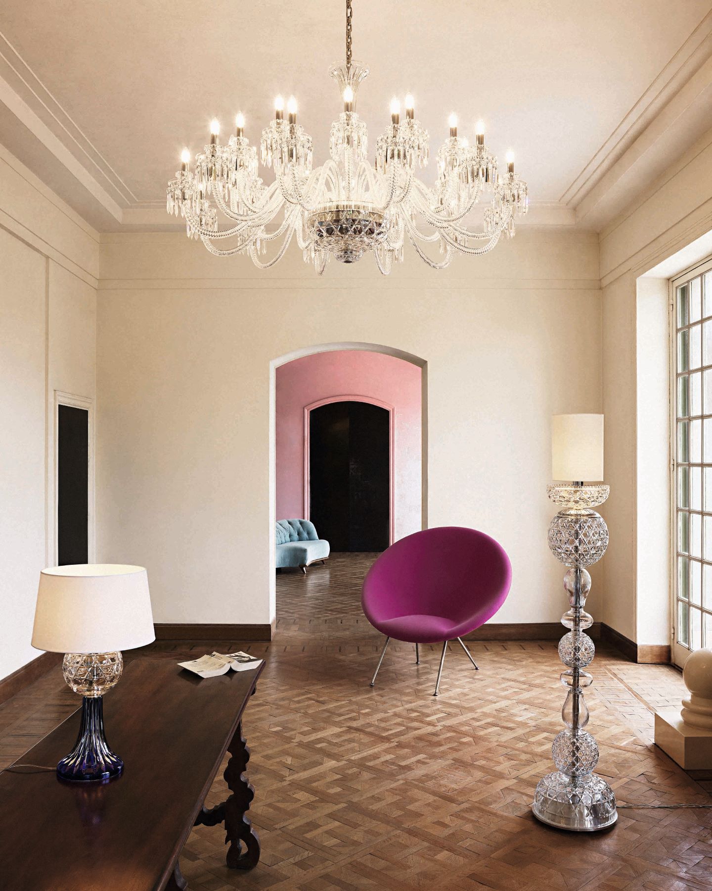 The result of special orders from royal courts, the first chandeliers appeared at Saint-Louis in the mid-19th century. Ever since, the manufacturer has continued to draw inspiration from its classics, introducing the Royal collection in 2015. Saint-Louis’ Royal Chandeliers are crafted by master glass-blowers and cutters considered to be among the very best in France. Crystal is glass blown, hand-cut, hand-engraved and hand-decorated using 24-karat gold or platinum. Other than chandeliers, the collection also includes sconces, table lamps, floor lamps, ceiling lights, candelabras, boxes and cups. Each piece can be customised through cuts, decoration and colours (size, style and colours).